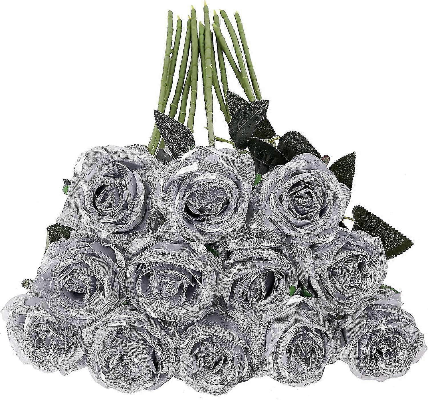 2025 12 PCS Artificial Roses, 50cm Single Long Stem Fake Rose (Silver)