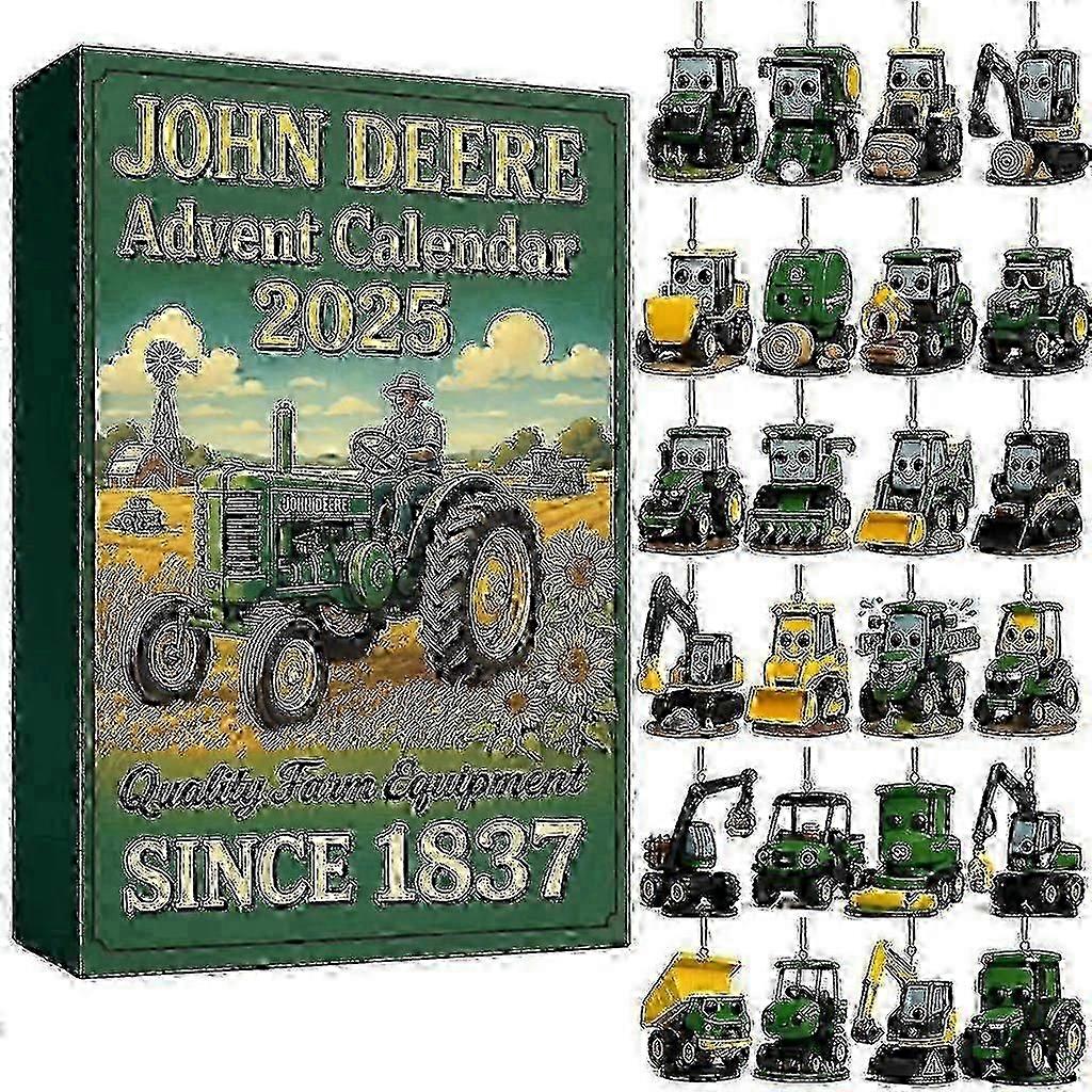 John Deere 2025 Advent Calendar Bring the farm spirit into your holiday season! This 24-day advent calendar celebrates iconic John Deere tractors and farm machinery.Inside, you'll find 24 miniature farm equipment ornaments (3.5-4cm tall), each featuring an adorable Funko-style design with a friendly face and classic John Deere green and yellow . Classic tractor and loaderHarvester, excavator, and dump truckFunny version with sunglasses and playful designPerfect for Christmas tree decorationsDon't waitJohn Deere fans around the world are snapping it up! Make December 2025 unforgettable with this festive, farm-inspired advent calendarCute Christmas gift box: Perfect for children, relatives, friends, and coworkers. It makes a great Christmas gift.Toy advent calendar: A fun way for kids to countdown until Christmas with daily surprises. This helps build their patience.Package includes: 24-day* John Deere 2025 advent calendar.Note:1. Due to different monitors and lighting effects, actual colors may vary slightly from the image!2. Due to manual measurement, please allow 1-3 cm deviations!Note: Due to the light and screen setting difference, the item's color may be slightly different from the pictures. Please allow slight dimension difference due to different manual measurement.