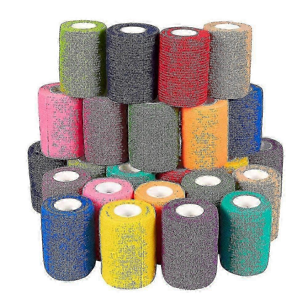 BANDAGE WRAPS: This bandage wrap easily adheres to itself but will not stick to other surfaces such as skin or hair making it easy to pull it off and change bandages^ STRONG SELF-ADHESIVE: This bandage is a strong self-adherent tape that offers excellent support; unlike non-adhesive bandages, the self-adhering bandage wraps do not require clips or pins to stay in place^ MULTI-PURPOSE: Use to wrap ankle, wrist, finger, toe, elbow and knee; also ideal for use on pets^ DIMENSIONS: Each roll of bandage tape is 3 inches wide and 5 yards long^ WHATS INCLUDED: This value set includes 24 cohesive wrap bandages in 12 colors, including 2 of each color in tan, pink, magenta, green, orange, blue, navy blue, light green, teal, red, yellow, and purple