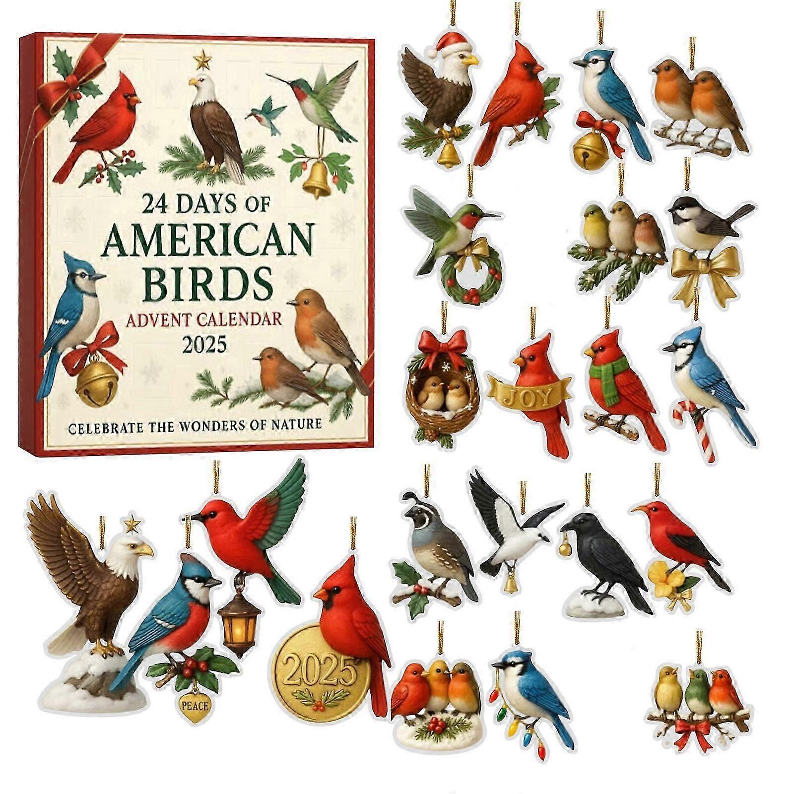 Meet a smart bird every day From December 1st to Christmas Eve, uncover a date grid every day and meet a smart and cute illustration of an American bird.Every day is a small discovery, allowing children to learn about nature in joy, and injecting knowledge and surprises into the Christmas countdown. Simple 2D design, easy to embellish the festive atmosphere This advent calendar uses a flat 2D design with a fresh and cute style.You can easily hang it on the Christmas tree, stick it to the window glass, or lean on the mantelpiece.It instantly adds a touch of childlike nature to your Christmas party and home space, and becomes a compelling holiday focus. Light up the continuous holiday expectations The core of this calendar is to create magic that lasts for 24 days.It has established an exciting holiday tradition, making every day full of which bird will you meet tomorrow?"The excitement makes the joy of Christmas slowly bloom throughout December. A gift that brings daily surprises For bird lovers, families or friends who like unique Christmas decorations, this is a gift full of heart.It is not only an item, but also a surprise experience that lasts for 24 days, conveying the warmth and expectation unique to the festival. Size: height 3cm/1.18 inches, thickness 0.3 cm/0.12 inches.