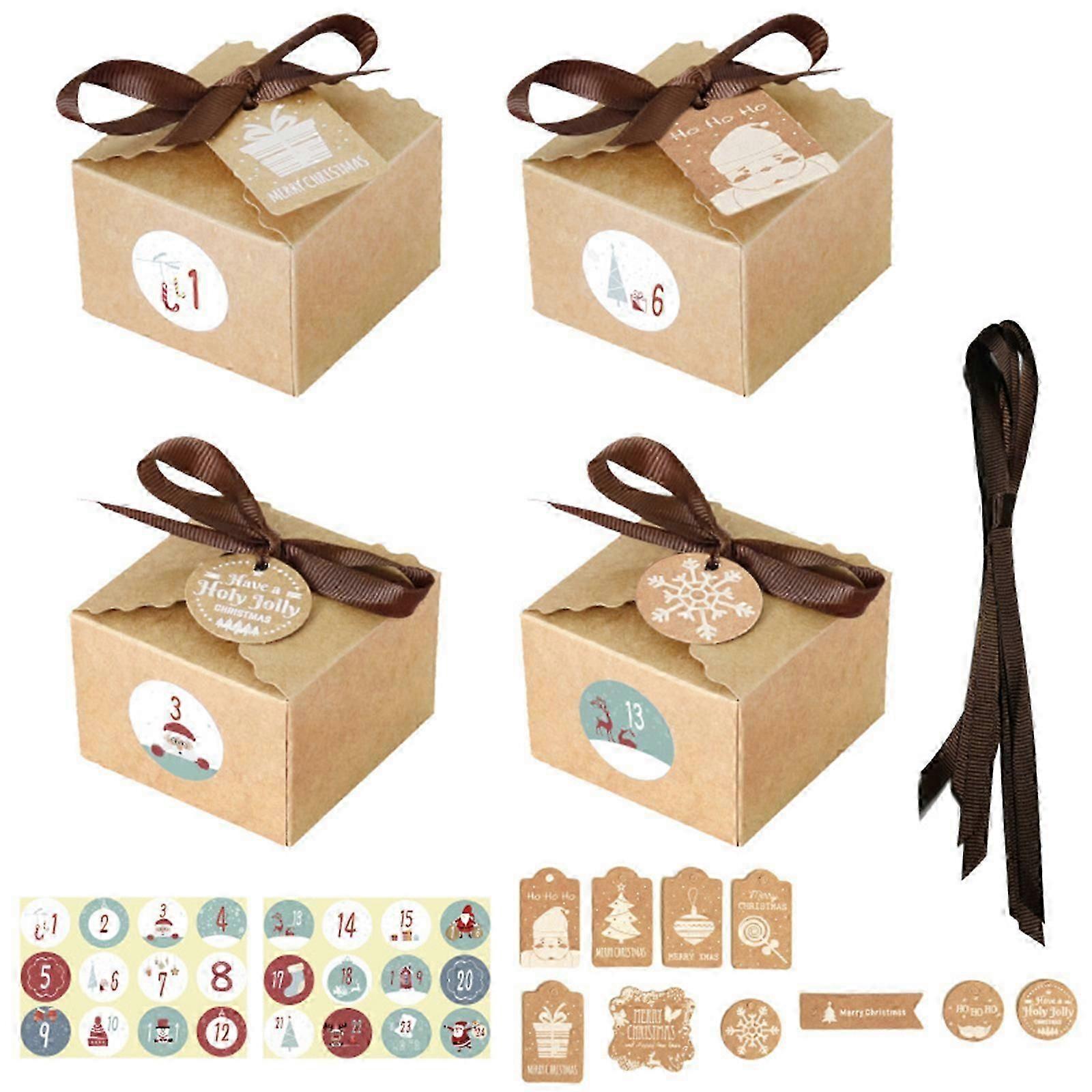 24 Sets Christmas 1-24 Advent Calendar Kraft Paper Candy Box with Tags Stickers Ribbon Gift Storage Decoration