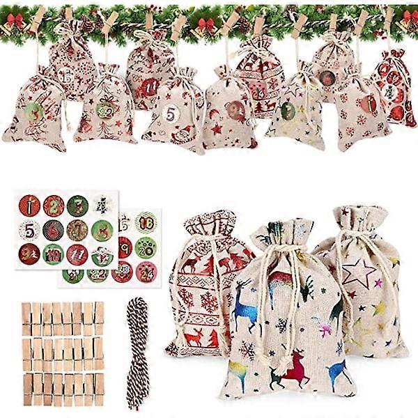 24 Christmas Calendar Bags Burlap Sack Hanging Advent Calendar Garland Candy Gift Bag DIY Countdown