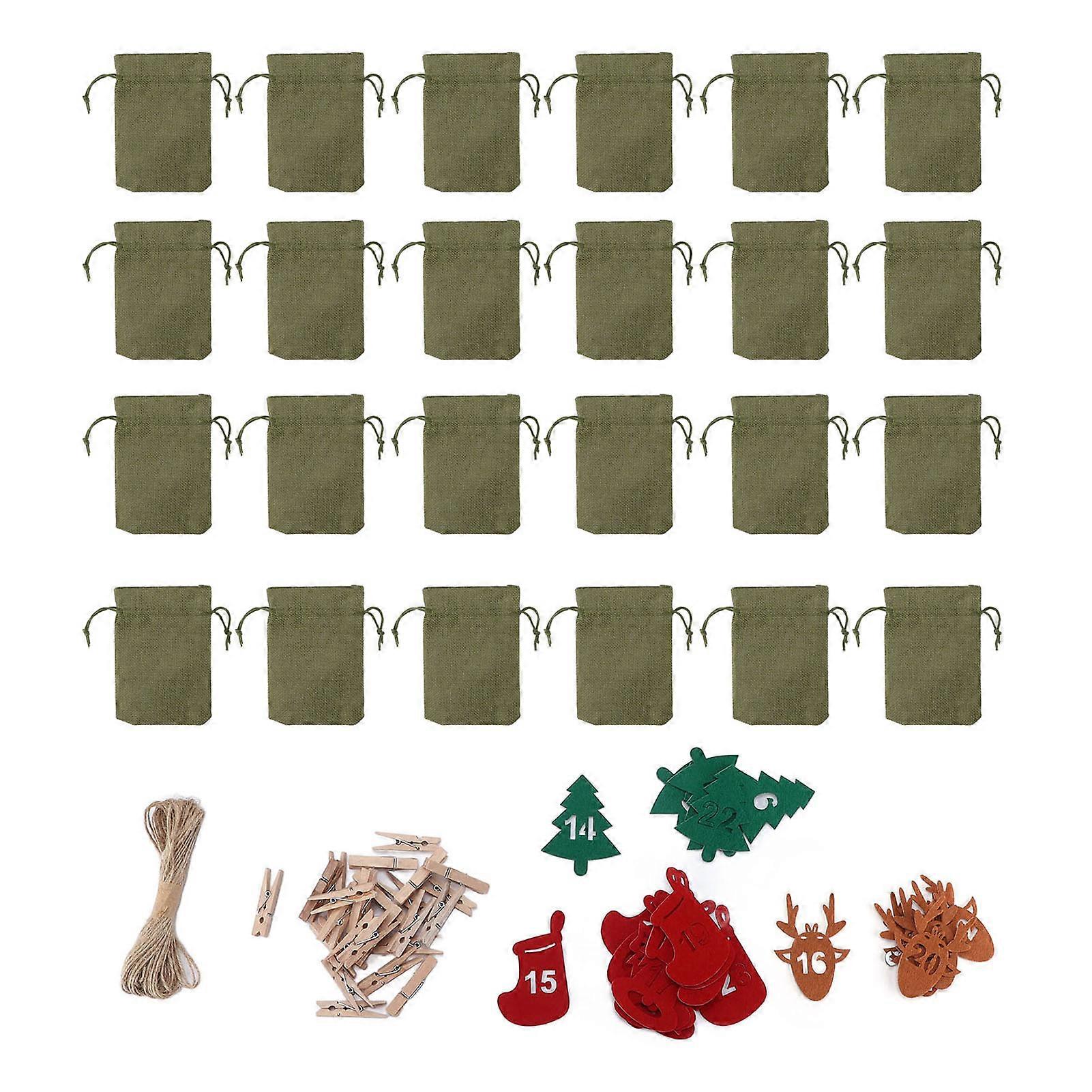 24Pcs Christmas Advent Calendar Drawstring Bags Reusable Hanging Countdown Pouch for Candy Jewelry GiftGreen