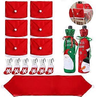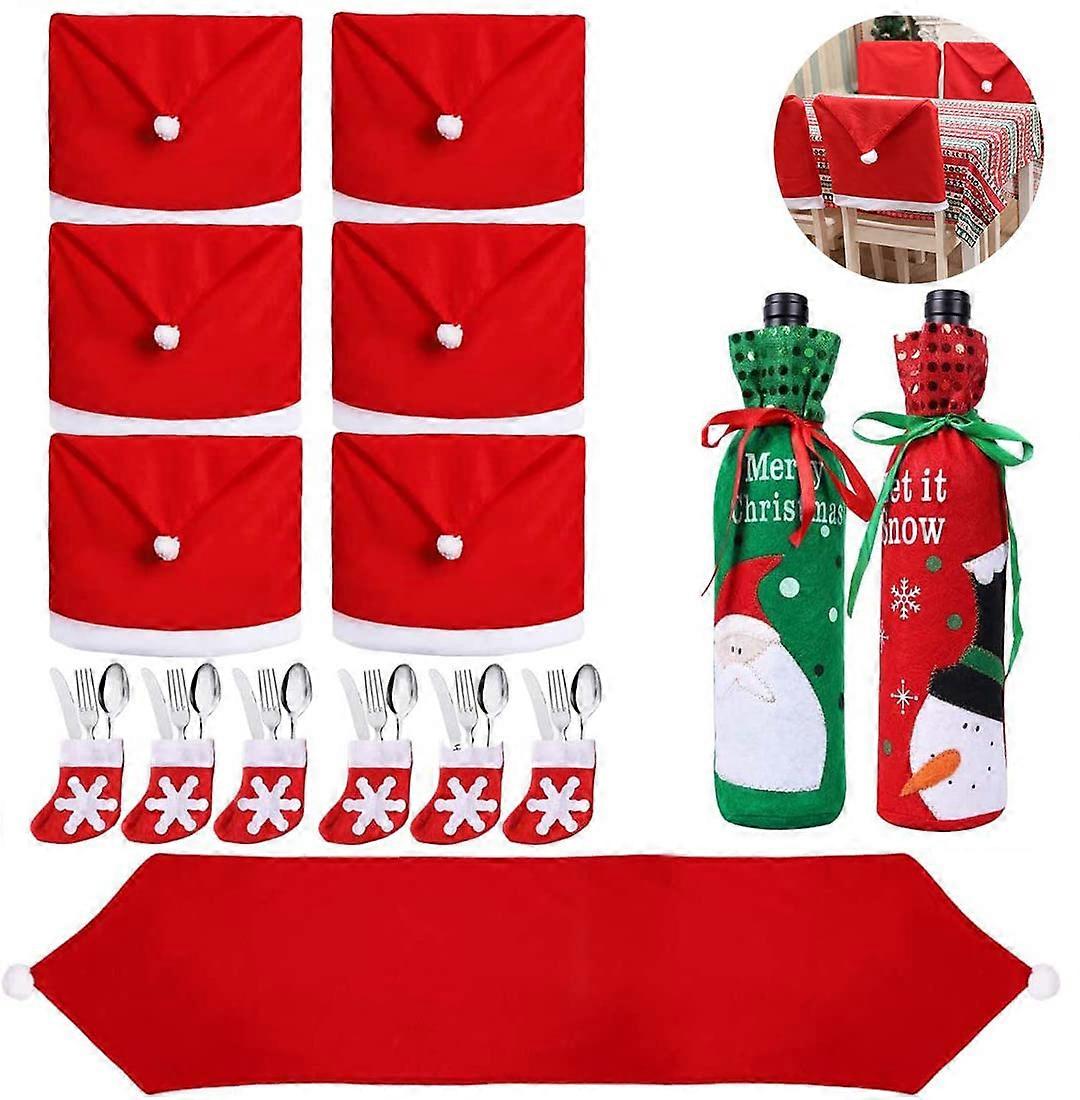 25PCS Christmas Dinnerware Set for 6 Kitchen Dinner Table Decorations Santa Claus Hat Table Runner Chair Back Covers Wine Bottle Cover Bags Cutlery Ba