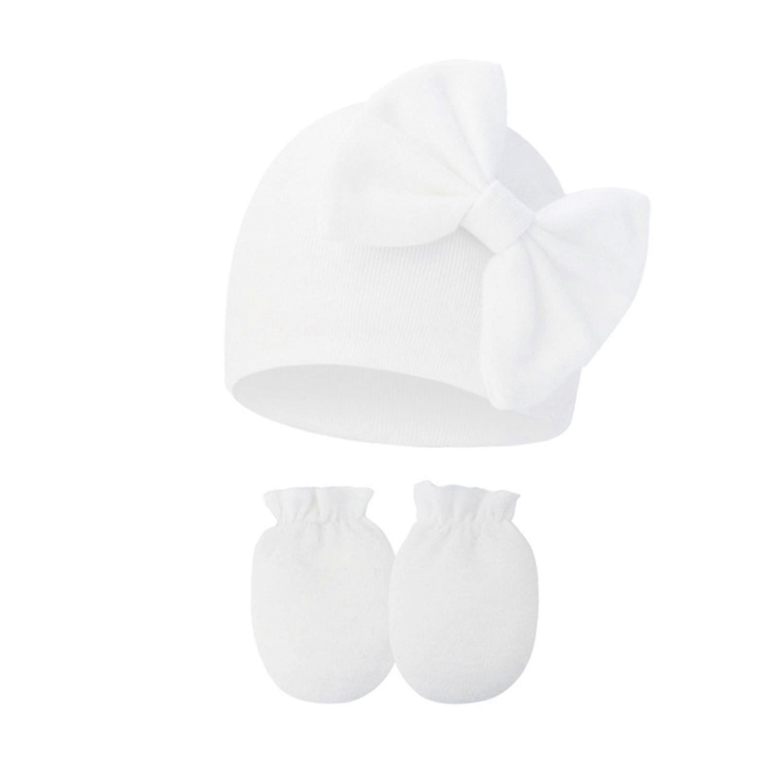 2pcs/set Cotton Newborn Caps with Anti Scratch Mittens Infant Boys Girls Warm Headwear Baby Gloves with Warm Bonnet White