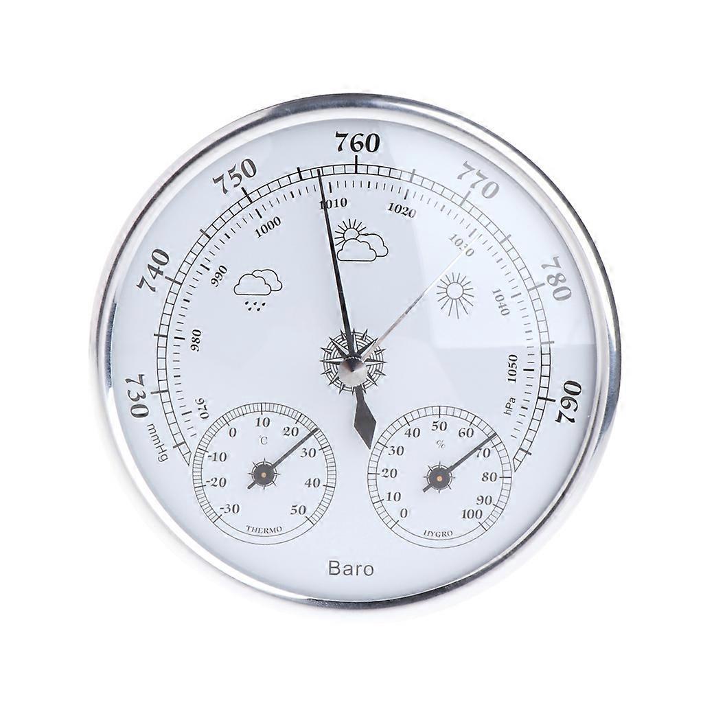 ["Descriptions:\r\nThis product is used to measure the changes of the parameters of the temperature, humidty, atmospheric pressure. According to the variation tendency of the environment's temperature, humidty and air pressure, it can predict the weather accurately. Thus, it can be a multifunctional household weather forecasting instrument.\r\n\r\nFeatures:\r\nWith barometer, thermometer and hygrometer, 3 in 1 multifunction, economical and practical\r\nStandard measuring range, predict the weather more accurately\r\nLightweight and easy to install, suitable for hanging or placing on a surface\r\nSimple and elegant design make you more comfortable when using it\r\n\r\nSpecifications:\r\nMeasurement Range: -30~50℃; 0~RH; 970~1050hPa\r\nResolution:1hPa, 1℃, 2%RH\r\nAccuracy: ±2℃,±5%RH(30~80%RH),±5hPa(970~1040hPa)\r\nDiameter: 13cm/5.12\"\r\nThickness: 4.1cm/1.61\"\r\nQuantity: 1 Pc\r\n\r\nNote:\r\nPlease allow 1-3mm error due to manual measurement.pls make sure you do not mind before you bid\r\nDue to the difference between different monitors, the picture may not reflect the actual color of the item.\r\nThank you!\r\n\r\nPackage Contents:\r\n1 x Thermometer Hygrometer Barometer"]