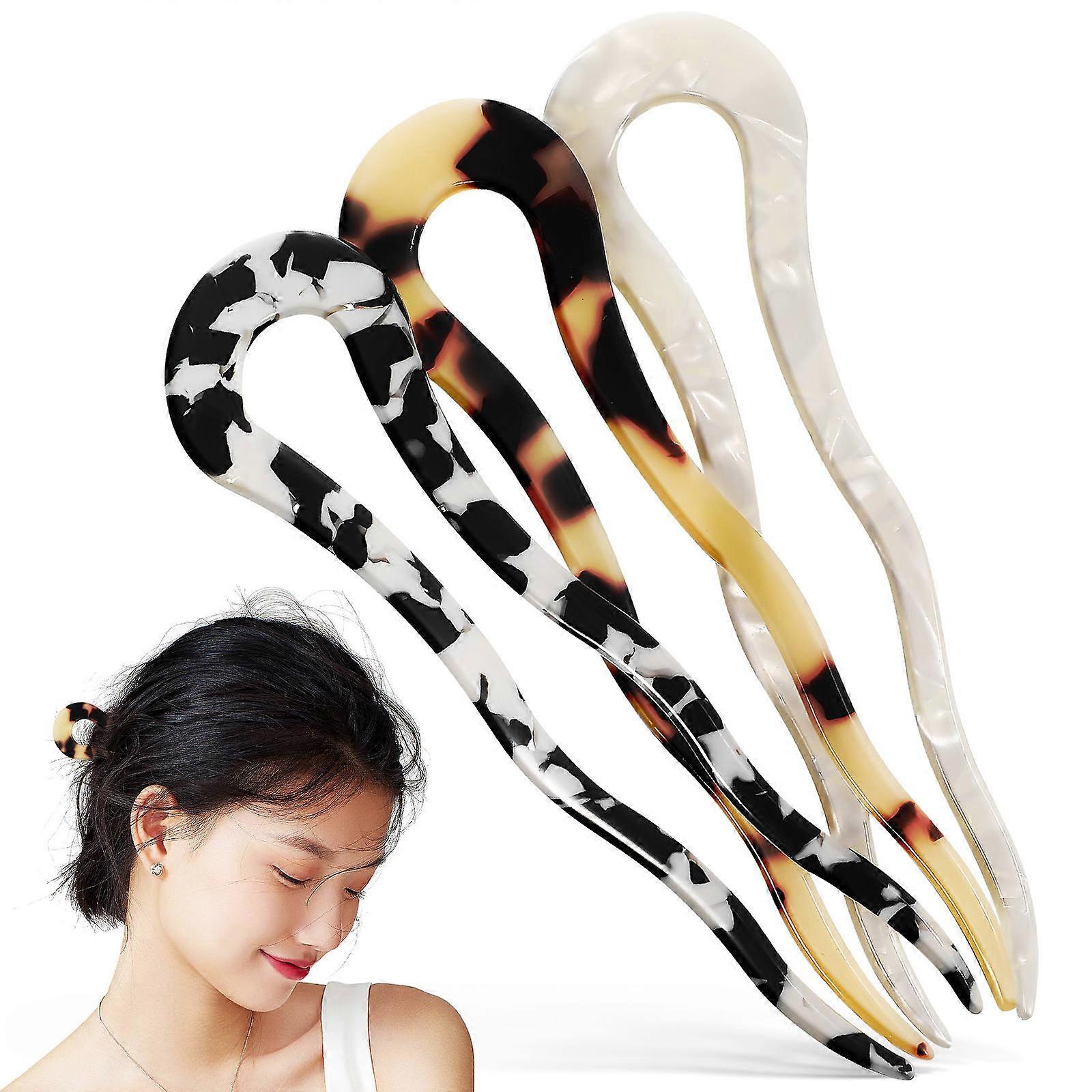 3pcs Acetate U Shaped Hairpins for Women – Lightweight Decorative Hair Forks with Tortoise, Cow Print & Solid Colors for Stylish Hairstyles &