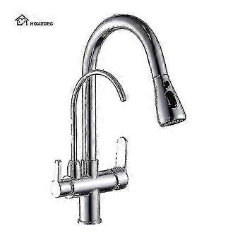 3-Way Pull Out Kitchen Tap with Drinking Water Filter, Matt Black Chrome & Brass Finish for European Market
