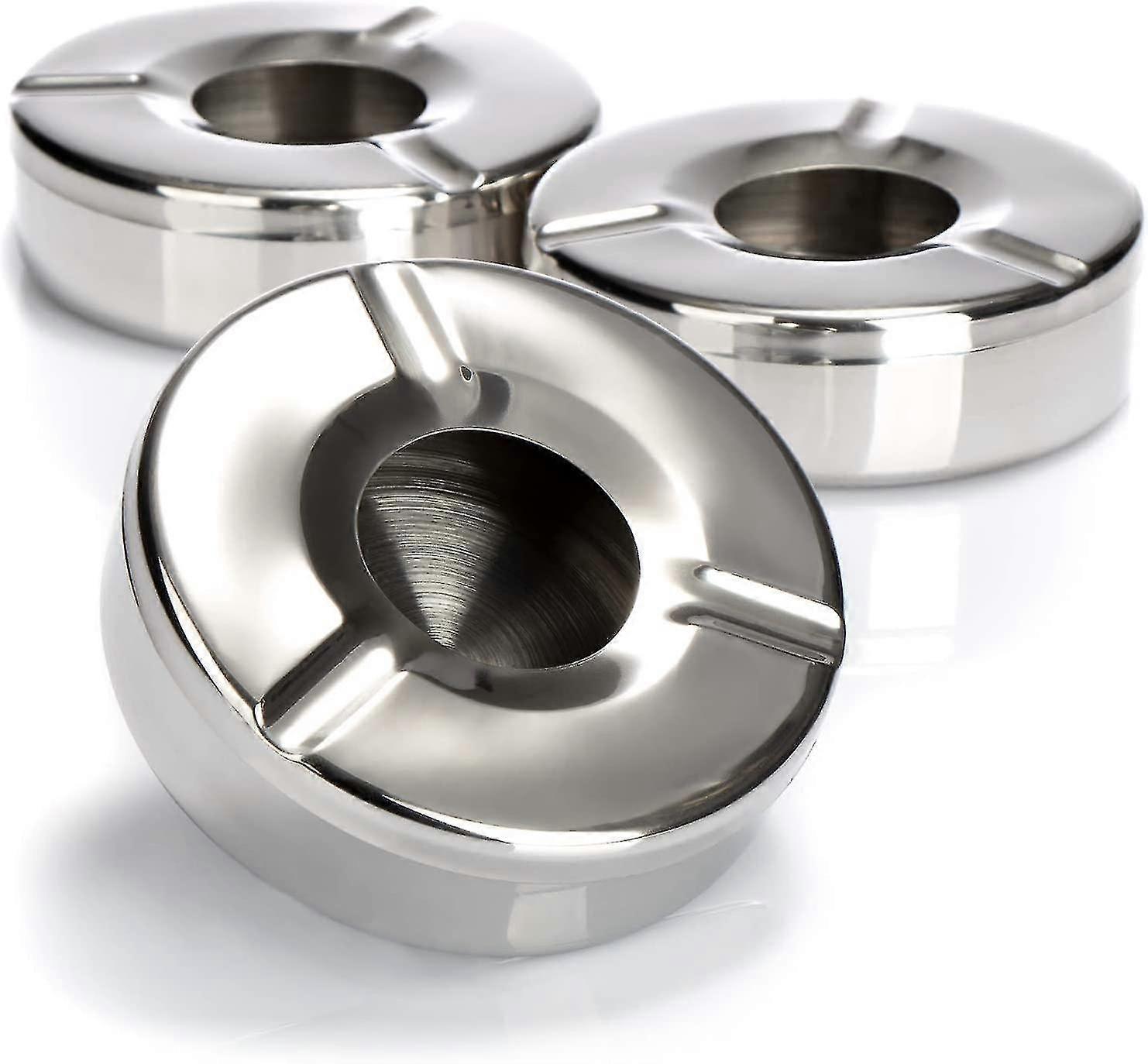 3x Stainless Steel Ashtrays - Wind Ashtray With Removable Lid To Protect From Fly Ash - 12 Cm (3 Pieces - Stainless Steel)