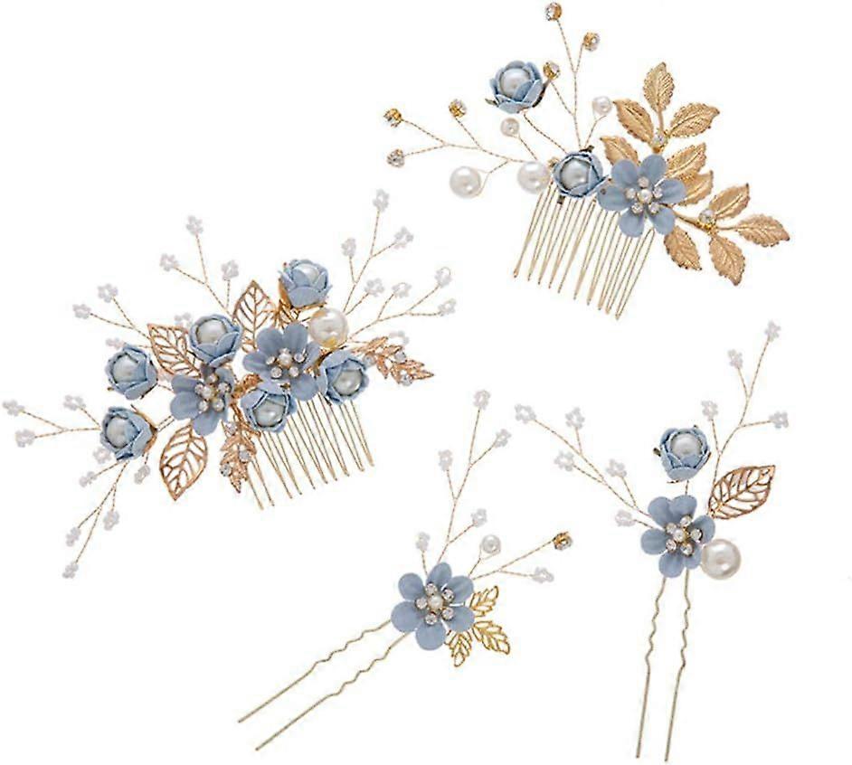 4Pcs Wedding Hair Clip Comb Handmade Bridal Hair Clip Pearl Floral Leaf Hair Accessories for Women Wedding ( Blue )