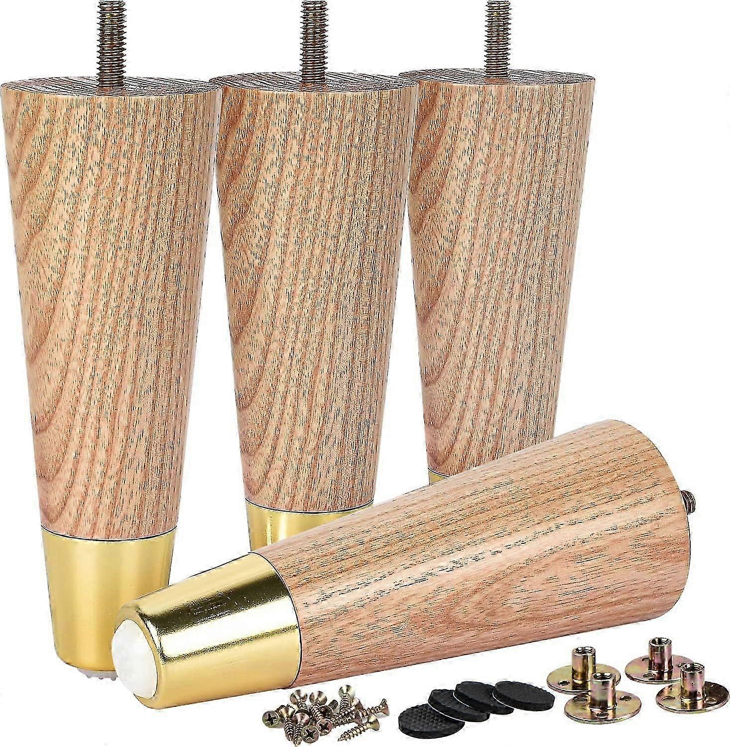4 inch Ash Wood Furniture Legs with Gold Caps, LAVANE Set of 4 Mid-Century Modern Tapered Varished Wooden Replacement Feet with Pre-Drilled M8 Bolt &