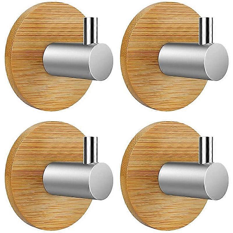 4 Pieces Stainless Steel Adhesive Hook with Wooden Base for Coat Belt Helmet