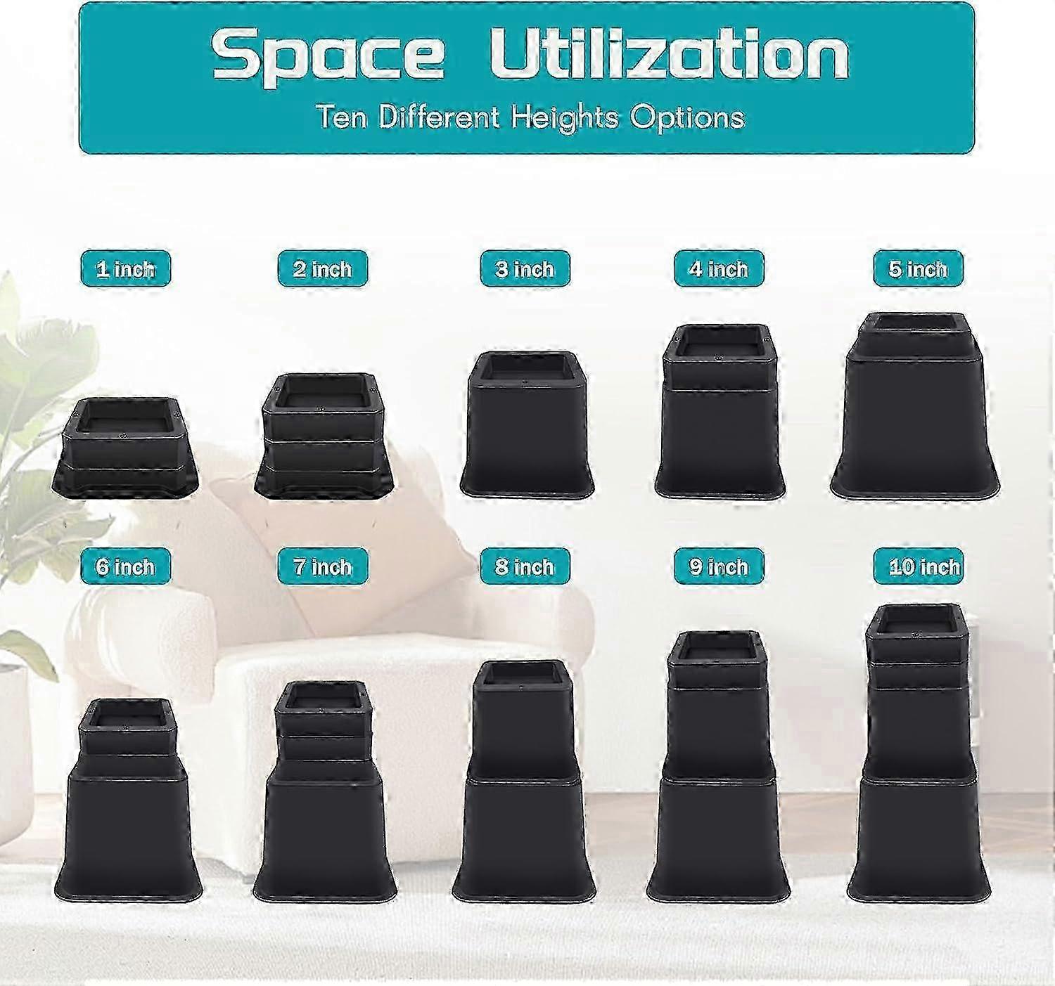 4 Pack 10 Inch Furniture Bed Risers for Lifting and Leveling Beds, Sofas or Tables