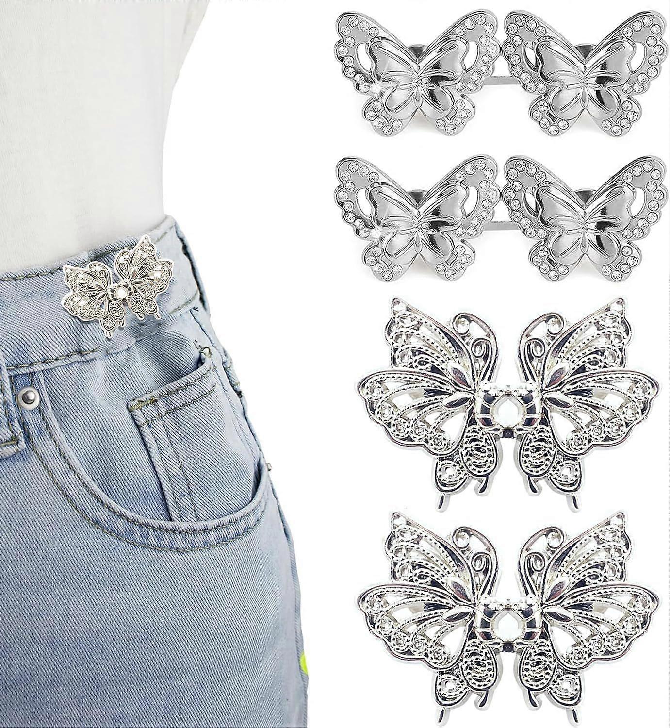 4 Sets Pant Waist Tightener, Butterfly Jeans Buttons for Loose Jeans, Adjustable & Detachable Crystal Pants Clips for Waist, No Sew Button for Jeans t