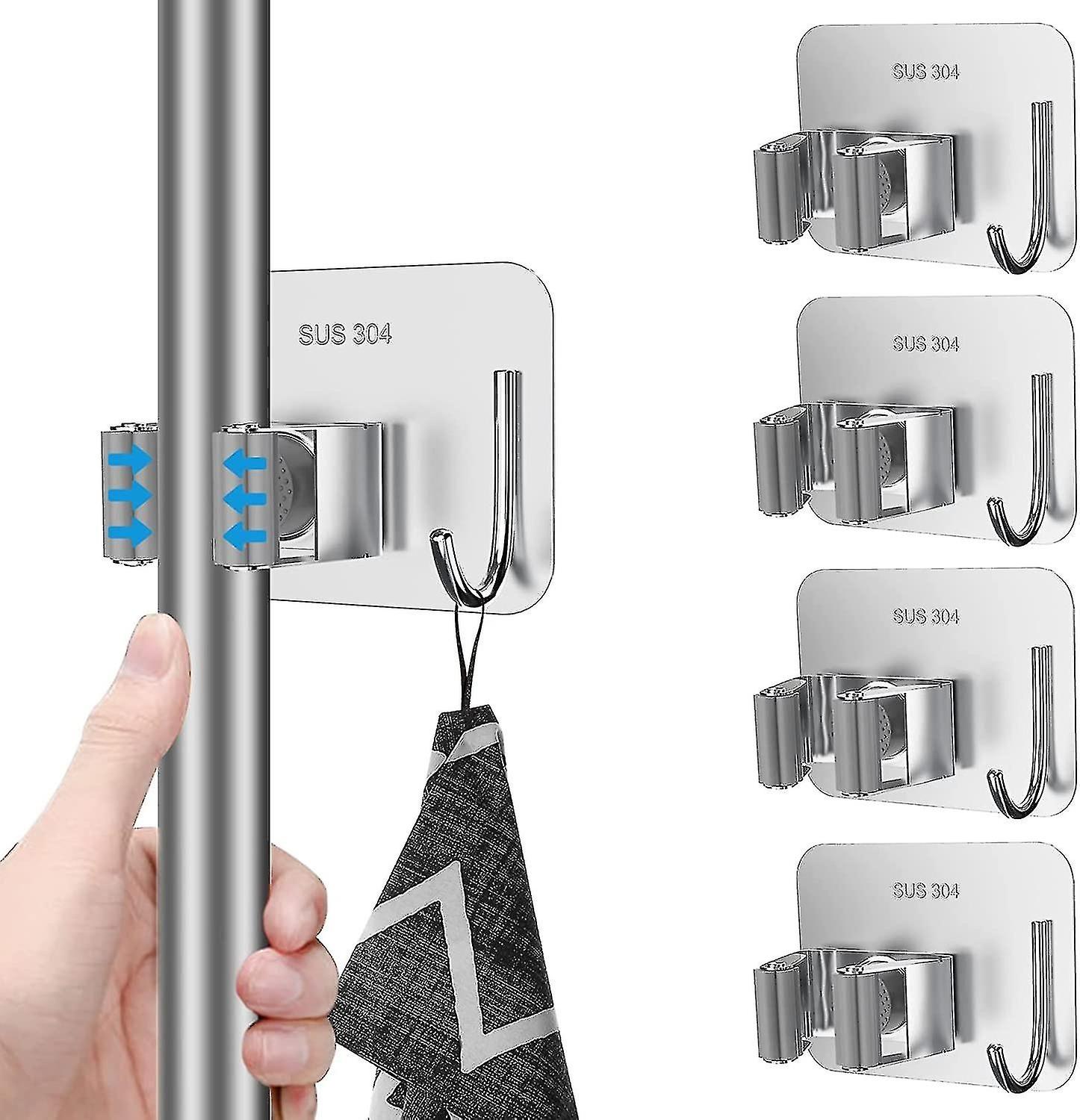 4 Pack Mop Broom Holder, Wall Mount Stainless Steel No Drill Mop Holder With Hook, Mop Broom Organiz