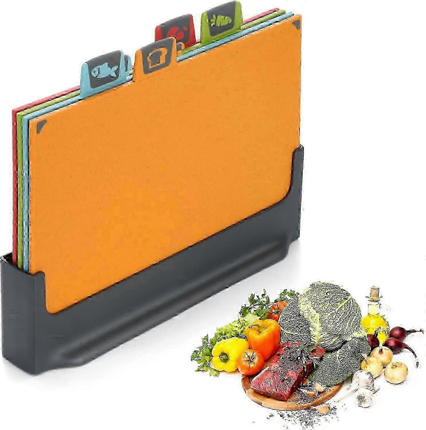 About this item Kitchen Essentials Set: To avoid confusion when using chopping boards, we have designed 4 colour-coded chopping boards. They can be used for processing vegetables, seafood, raw meat and cooked food. In addition, the markings and colours on the chopping board help to keep raw and cooked food in a hygienic and healthy way. Chopping board can be turned over for use, so that flavours of the food do not interfere with each other. Non-slip feet: Each chopping board is equipped with non-slip feet on all sides, tightly surrounding the table top, so you don't have to worry about it slipping when cutting food. On the edge of the chopping board there is also a handle that allows you to easily transfer the food from the kitchen worktop to the stove. Unique design: Our chopping boards are designed differently for different foods. The chopping board for raw food has a recess on one side so that you can handle smooth fish better and cannot cut into your hand. Chopping board for vegetables and raw meat have grooves on the edges to catch juices and avoid stains. The deli boards have larger grooves on the surface to catch crumbs and make it easier to throw off. Cleaning and storage: Our plastic chopping board has a smooth and even surface, unlike wooden chopping boards, which tend to leave hard-to-clean food residue. Therefore, you can clean it with water or dishwasher safe after use. It also has a base for storage that does not take up too much space in your kitchen. Base is hollow, which facilitates drainage and keeps the chopping board clean and tidy. Materials and robust: Wheat straw is a new, renewable, natural composite material that is BPA-free. Compared to the wooden chopping board, plastic synthetic material of the chopping board is more hygienic, not easy to mould, also does not need to use special sticky board oil for careful care. And it is very hard, not easy to deform or bend, with a sharp knife in the use of the above will not easily leave scratches. Best gift: Our coloured chopping board set is the absolute best gift for your friends and family. It is the perfect gift for birthdays, Christmas or housewarming We really hope that you and your loved ones will enjoy cosy evenings and dinners with our chopping boards for years! There is nothing better than seeing your happy faces! See more product details Vegetable cutting board: Bevelled edge to catch juice and prevent slipping out of the chopping board. Cutting board for raw meat: Juice collection groove for catching blood from raw meat and avoiding stains on the kitchen worktop. Fish cutting board: Fish grip area to increase friction and easily hold smooth fish to prevent cutting of hands, which is safer. It can also be used to rub garlic paste, double purpose! Chopping board for cooked food: Crumb catcher grooves for catching chopped crumbs for easy tipping out, more convenient and hassle-free. Unique non-slip design: non-slip feet on each chopping board ensure that the board does not slip when cutting and preparing food. Double-sided use: Chopping board both sides can be used, one of which has a deep juice groove to catch draining juice. This prevents the kitchen worktop from getting dirty. Colour coded: Different coloured chopping boards for different foods, so it is clear that bright colours are better for us to recognise when we need them. CUTTING BOARD BASE Convenient storage, card slot for stabilising the chopping board, hollowed base for hydrophobic ventilation, cleanliness and hygiene Easy to clean Smooth surface, clean with water, dishwasher safe, resistant to mould, no special care required