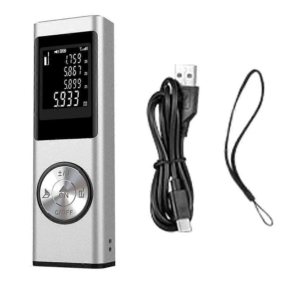 1: Pythagoras function for remote measuring of height or length 2: Addition / Subtraction calculation and areaolume measurement 3: Backlit display shows multiple readings. 4: Audible alarm Name:Distance Meter with a measuring range of 0.05-40m Laser auto off:60s Power auto off:60s Measuring distance:0.05-40m Accuracy:±1.5mm/±0.06in Measurement units: m/in/ft Laser Type:Red laser, 635nm, Less than 1mW, Class II Operating temperature:0-40℃,(32-104℃) Battery:Powered by 200ah 3.7v Dimensions:100mm x 12.5mm x 32mm Weight:100g Electronic level:With level Colour:Silver Material:Aluminum Alloy+ABS Package Contents: 1 x USB charging cable 1 x Lanyard 1 x Rangefinder 1 x English instruction manual