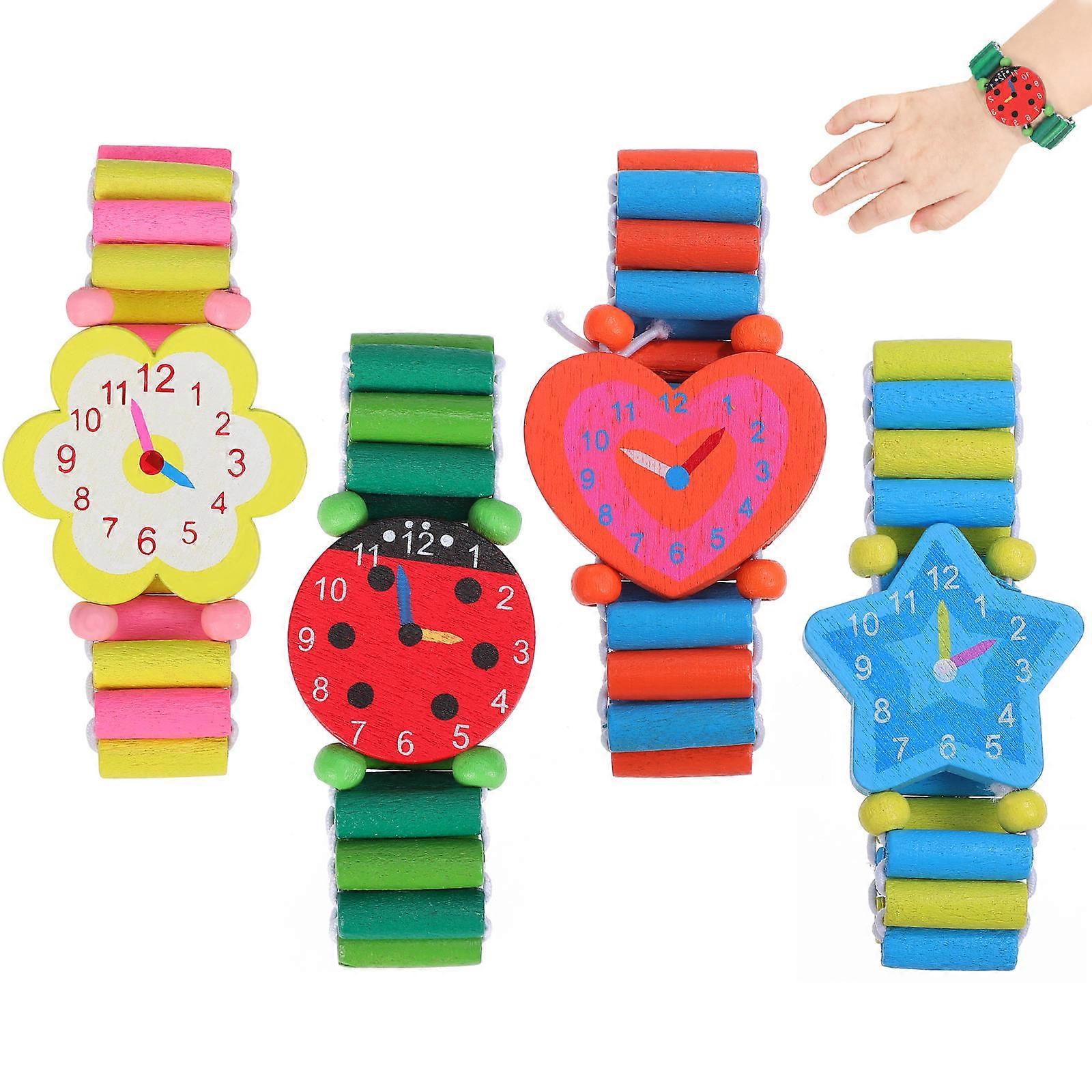4PCS Kids Watch Toy Stretchy Cartoon Wristband Pretend Play Wooden Wristwatch for Children, Assorted Colors