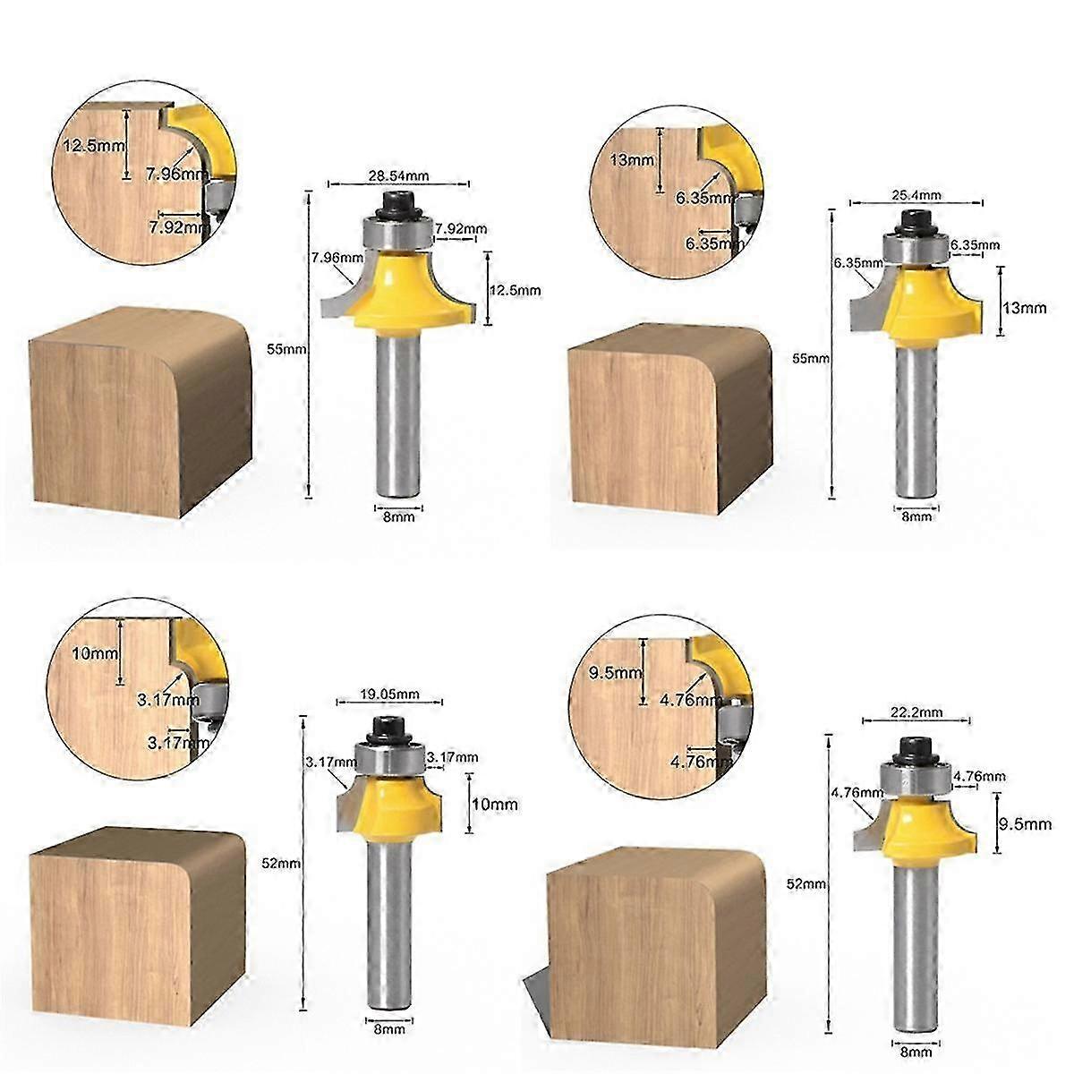 4pcs 8mm Shank Roundover Router Bit Set-woodworking Milling Cutter For Edge Rounding And Chamfering