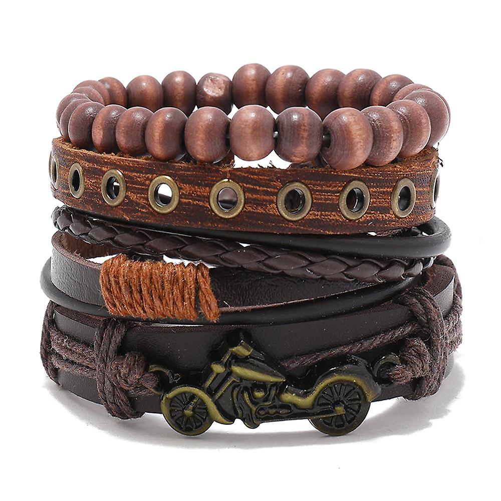 4pcs/ Set Braided Wrap Leather Bracelets For Men Vintage Life Tree Rudder Charm Wood Beads Ethnic Tribal Wristband Rope Bracelet