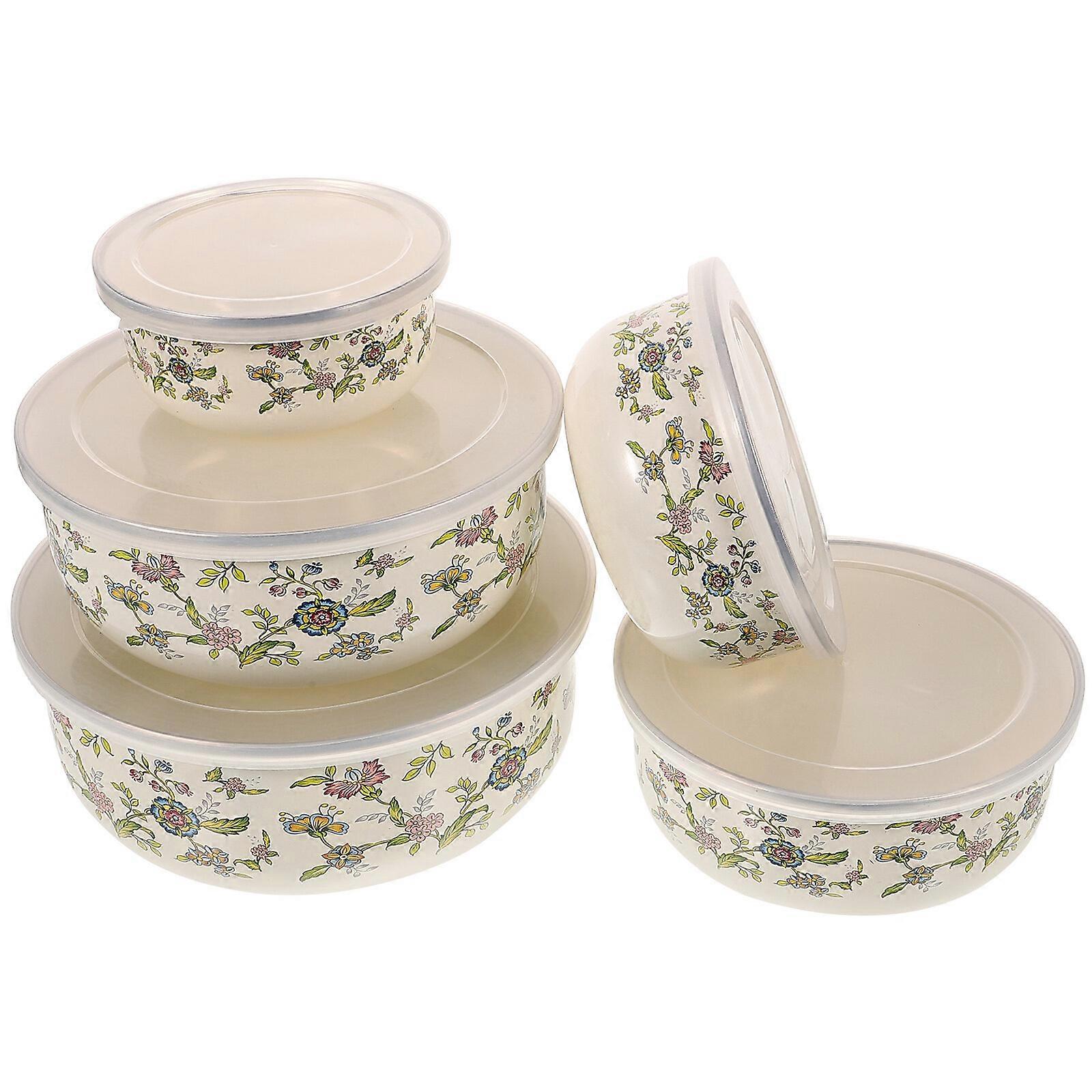 5pcs Enamel Bowls Fresh Keeping Bowls Food Bowls Salad Bowls Fruit Bowls with Lid
