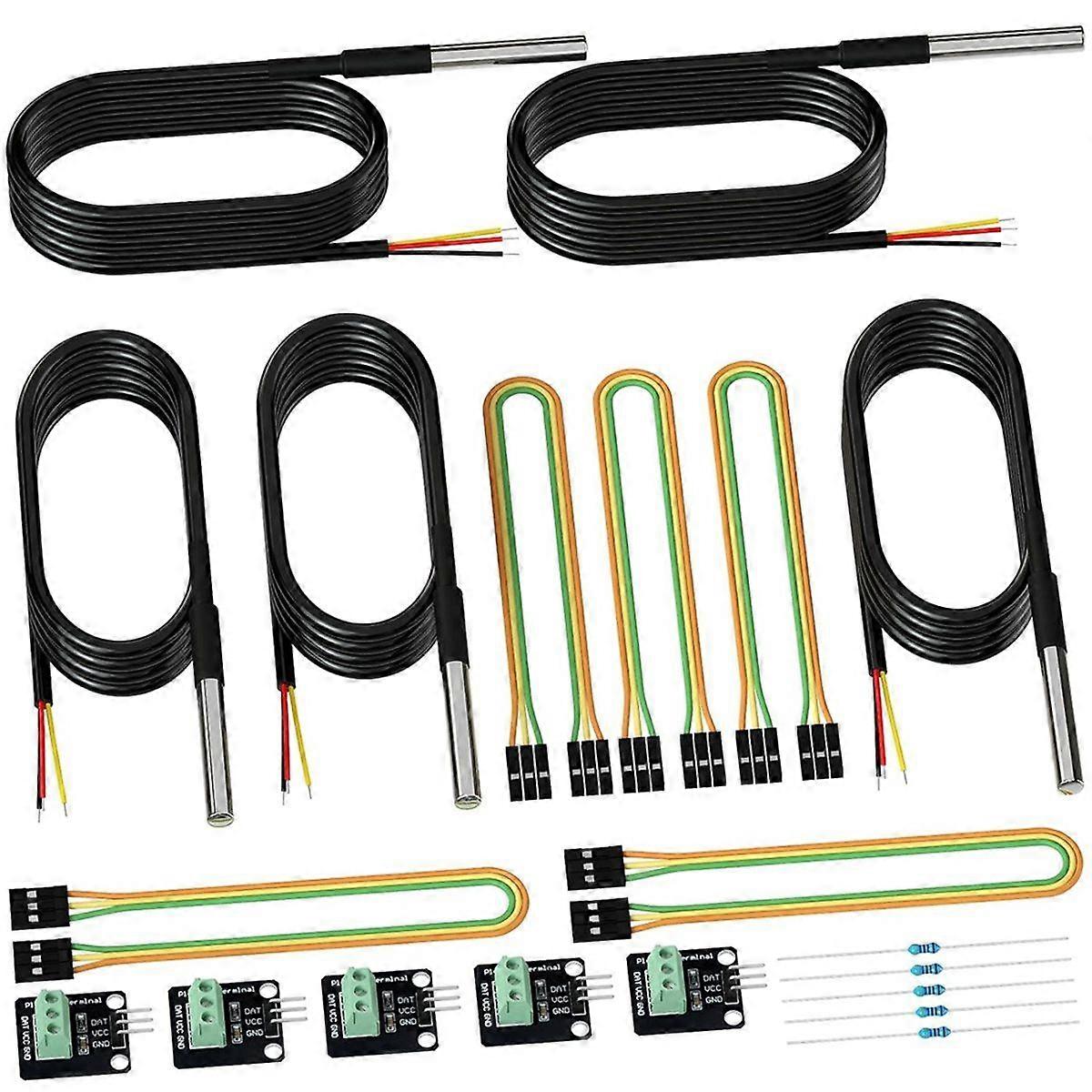 Waterproof & Probe: Encased in waterproof, , rustproof with highly thermally conductive sealant. Perfect for continuous submersion, wet environments, and harsh conditions. High Accuracy & Wide Temperature Range: Delivers precise temperature readings from -55C to +125C (-67F to +257F) with an accuracy of 0.5C. Ideal for demanding applications. Simple Wiring & Quick Integration: Features clearly separated red (VCC), yellow (Data), and black (GND) wires with heat shrink tubing. Easily connects to popular platforms like for , for , for ESP32, and for STM. Low Power & Flexible Voltage Operation: Efficiently operates on a wide voltage range of 3.0V to 5.5V, ensuring compatibility with various microcontrollers and development boards without complex power regulation. Reliable 1-Wire Interface & Tip: The adapter board has an integrated pull-up resistor, enabling direct connection to the for GPIO without an external resistor. Utilizes the robust for 1-Wire protocol for simplified communication. For optimal stability, use a 4.7K resistor between Data (Yellow) and VCC (Red). TREATMENT: Stainless RESOLUTION: 9~12 Bits Adjustable TEMPERATURE RANGE: -55C to +125C HIGH ACCURACY: 0.5C OPERATING VOLTAGE: 3V - 5.5V LENGTH:1m WIRING: Red (VCC), Yellow(DATA), Black (GND), Separated by Heat Shrink Tubing Using a 4.7K resistor between the Data and VCC make the testing easier. Color: As Shown Material: plastic Specification: C: Set Five Package Contents: 5 x Temperature Sensor Probes 5 x Probe Adapter Boards 5 x 3-Pin Female-to-Female Wires (random colors, don't accept the specified color) 5 x 4.7k Ohm Resistors Only the above package content, other products are not included. Note: Light reflection and different displays may cause the color of the item in the picture a little different from the real thing. The measurement allowed error is +/- 1-3cm.