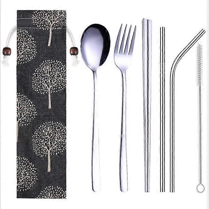 5-piece Japanese Stainless Steel Cutlery Set Spoon Fork Chopsticks Straw Cloth Packaging Tableware Portable Outdoor Travel BBQ