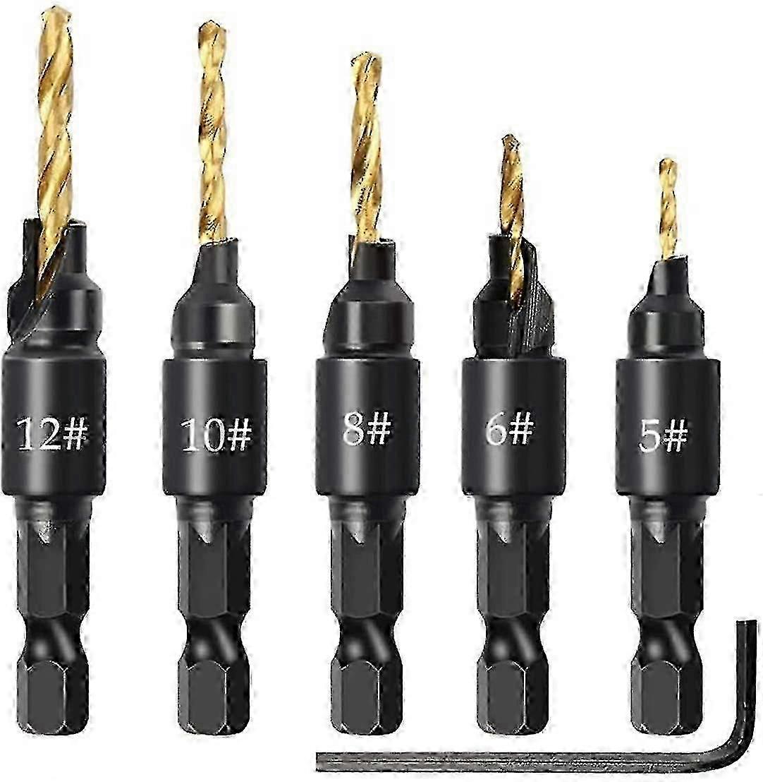 5 Piece Hex Shank Countersunk Twist Drill Bit Set, Hss Titanium Plated Wood Hole Opener
