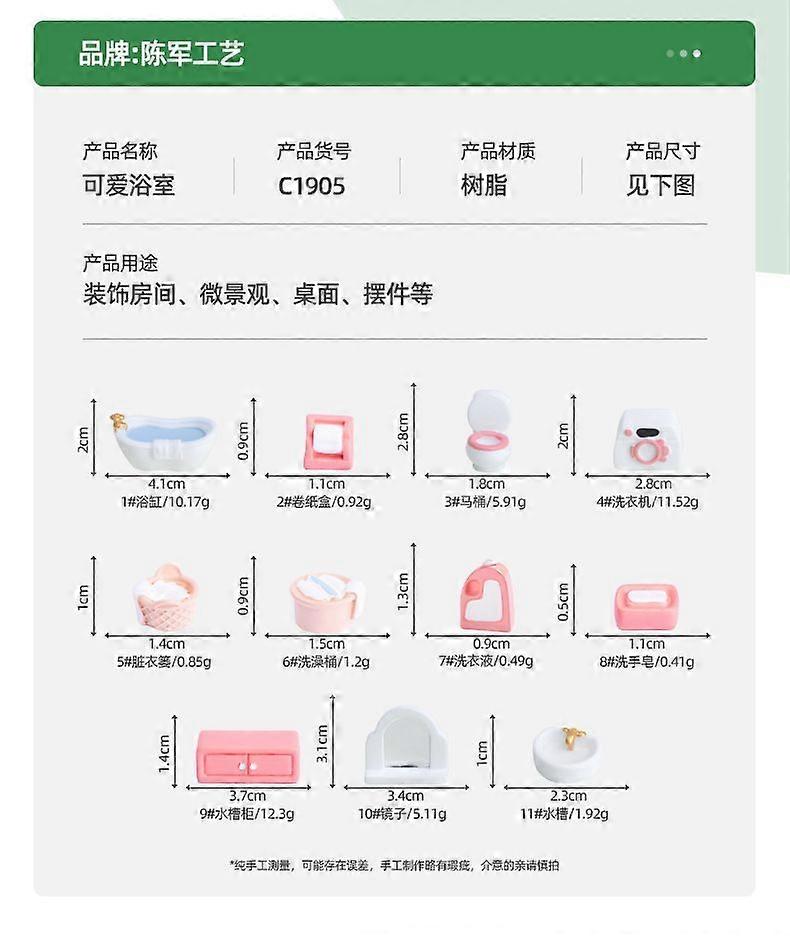 Description This miniature pink bathroom set is ideal for creating a charming and realistic dollhouse scene. The set includes various pieces of furniture and accessories that add a touch of elegance and detail to any miniature bathroom. Ideal for DIY enthusiasts, it allows you to create and decorate your dollhouse with ease. Features -Color:Assorted Color -Material:Resin -Size:4.10X2.00X2.00cm/1.61X0.79X0.79in -Bathroom dollhouse: create a cozy and romantic bathroom environment, allowing you to enjoy a comfortable bathing time -Diy decorations: create your bathroom style with these diy decorations, allowing you to mix and match according to your personal preferences -Miniature ornaments: small and compact, these mini ornaments can be placed in various corners of the bathroom without taking up much space -Functional and aesthetic: these items serve as both practical furniture and beautiful decorations, adding a touch of elegance to your bathroom -High realism design: the micro landscape design offers high realism, enhancing the charm of your living spacePackage list: 6 x Dollhouse Bathroom Furniture
