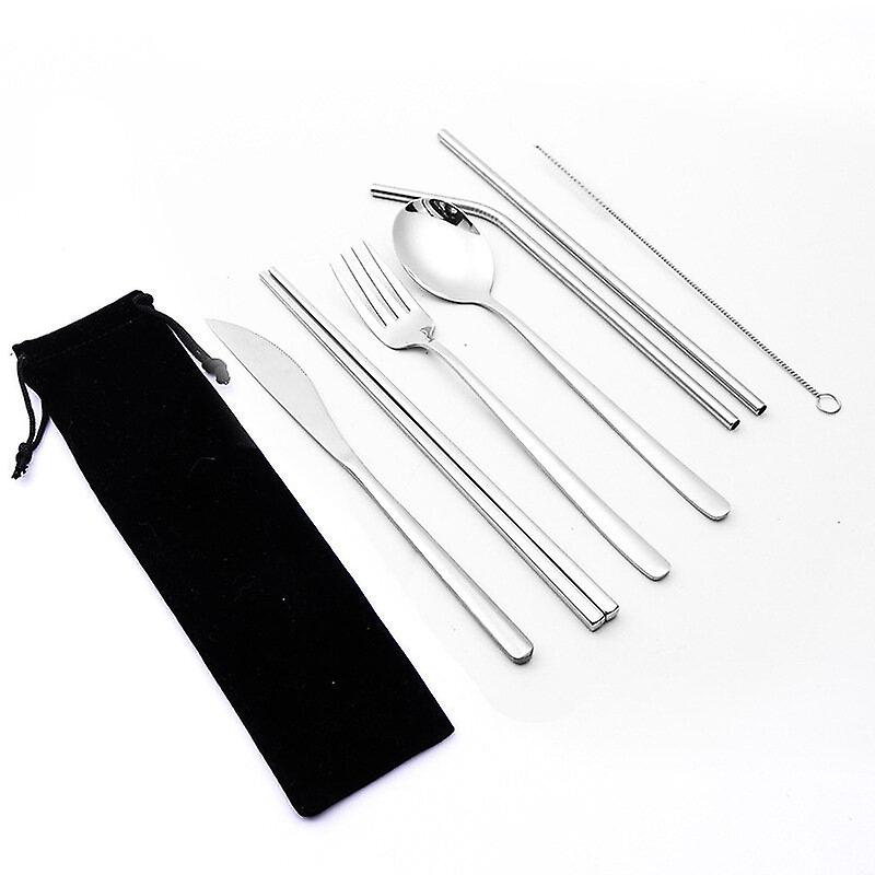 7 Pcs Tableware Set Stainless Steel Fork Spoon Knife Chopsticks Straw Brush Portable Flatware Outdoor Camping Picnic