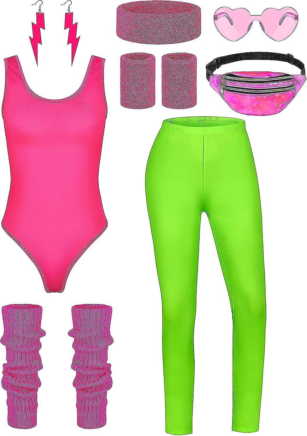 Women 80s Costume Sets: include 1 hot pink retro swimwear, 1 pair of blue jogging leggings, 1 pair of hot pink leg warmers, 1 pair of blue wristbands, 1 pair of hot pink vintage lightning earrings, 1 hot pink glasses, 1 blue headband, and 1 hot pink fancy bag, a total of 8 pieces, complete accessories set to help you create the 80s retro look