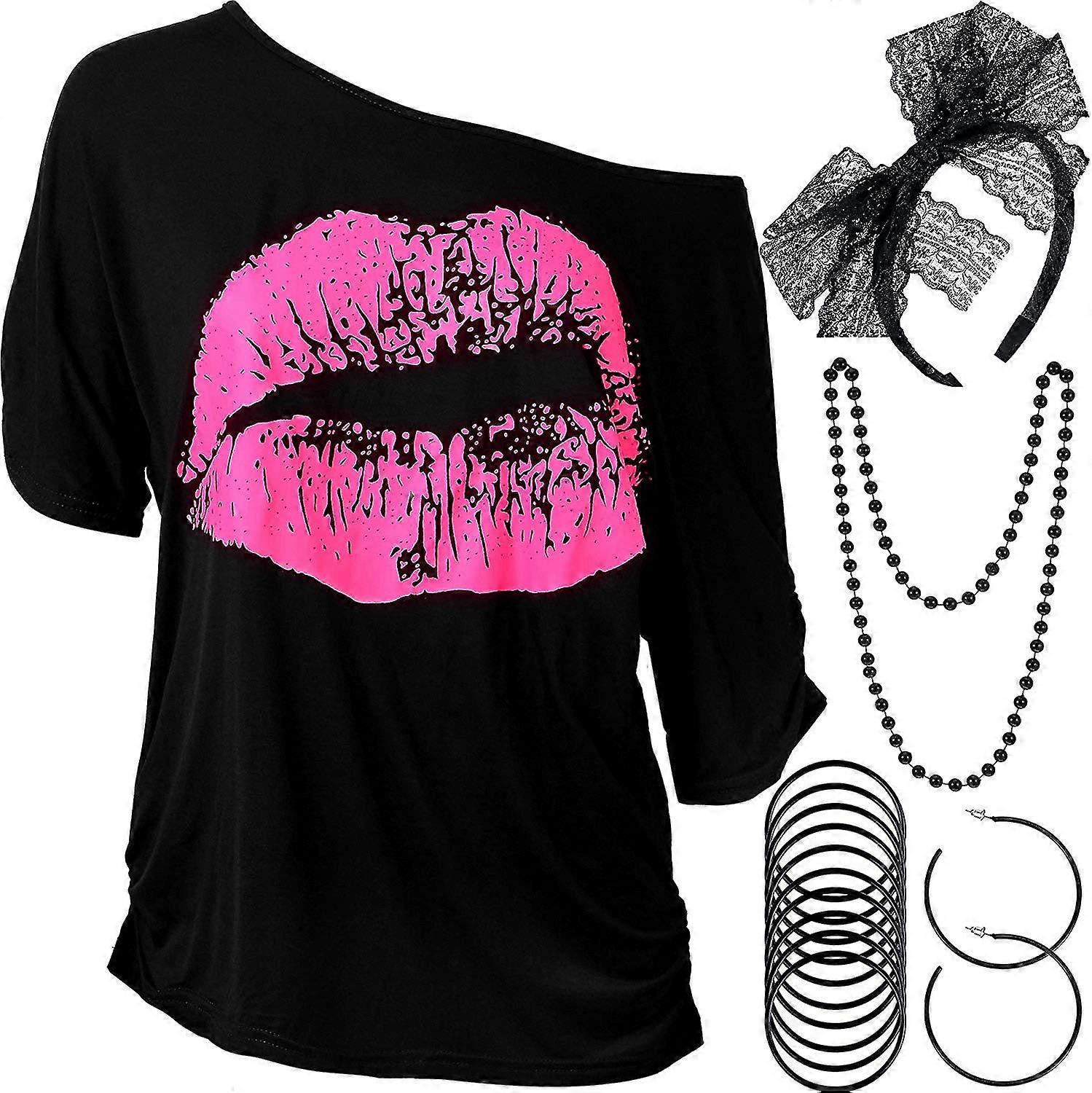 80s Costumes For Women, Lips Print T Shirt Lace Headband Earrings Necklace Bracelet For 80s Theme Party