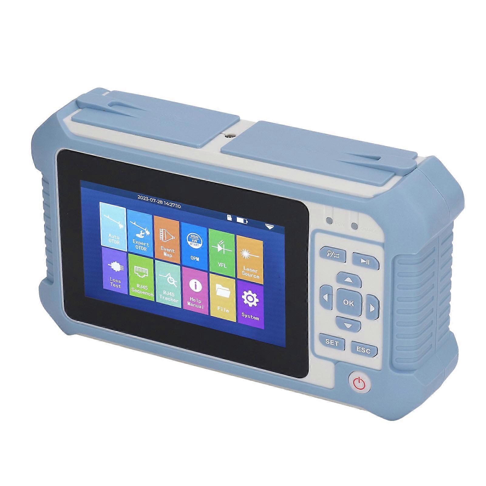9 in 1 Optic Fiber Cable Tester APC OTDR with Optical Power Meter Visual Fault Locator Line Finding Event Map 100‑240V EU Plug Item Type: Optical Time Domain Reflectometer Material: ABS Model: AUA513A Feature: Can test with light Connector Model: APC Optical Power Meter: -50 to +26dBm Stable Light Source: 1310nm Test Range: 80km Four Languages Can Be Switched: Chinese, English, Portuguese, Spanish Save Test Data: 100,000 sets (with 32GB memory card) Display: 4.3 inch 800x480P IPS capacitive LCD touch screen Power Supply: 7.4V 2200mah polymer lithium battery x 2 (built in) Rj45 Receiver Power Supply: 9V6F22 battery x 1 (not included) VFL Interface: 2.5mm universal SC FC ST OTDR Stable Light Source Interface: Can be freely replaced with SC APC, FC APC OPM Optical Power Meter Interface: 2.5mm universal SC FC ST Light Loss Test: FC SC interface range 0-30dB With Line Finding Testing Function: Can test straight line T568B and cross line T568A
