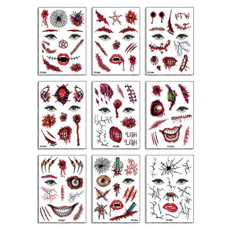 9 Sheets of Halloween Temporary Tattoos, Halloween Scar Tattoo and Wound Tattoos Fake Scabies Blood Spider Face Stickers for Halloween