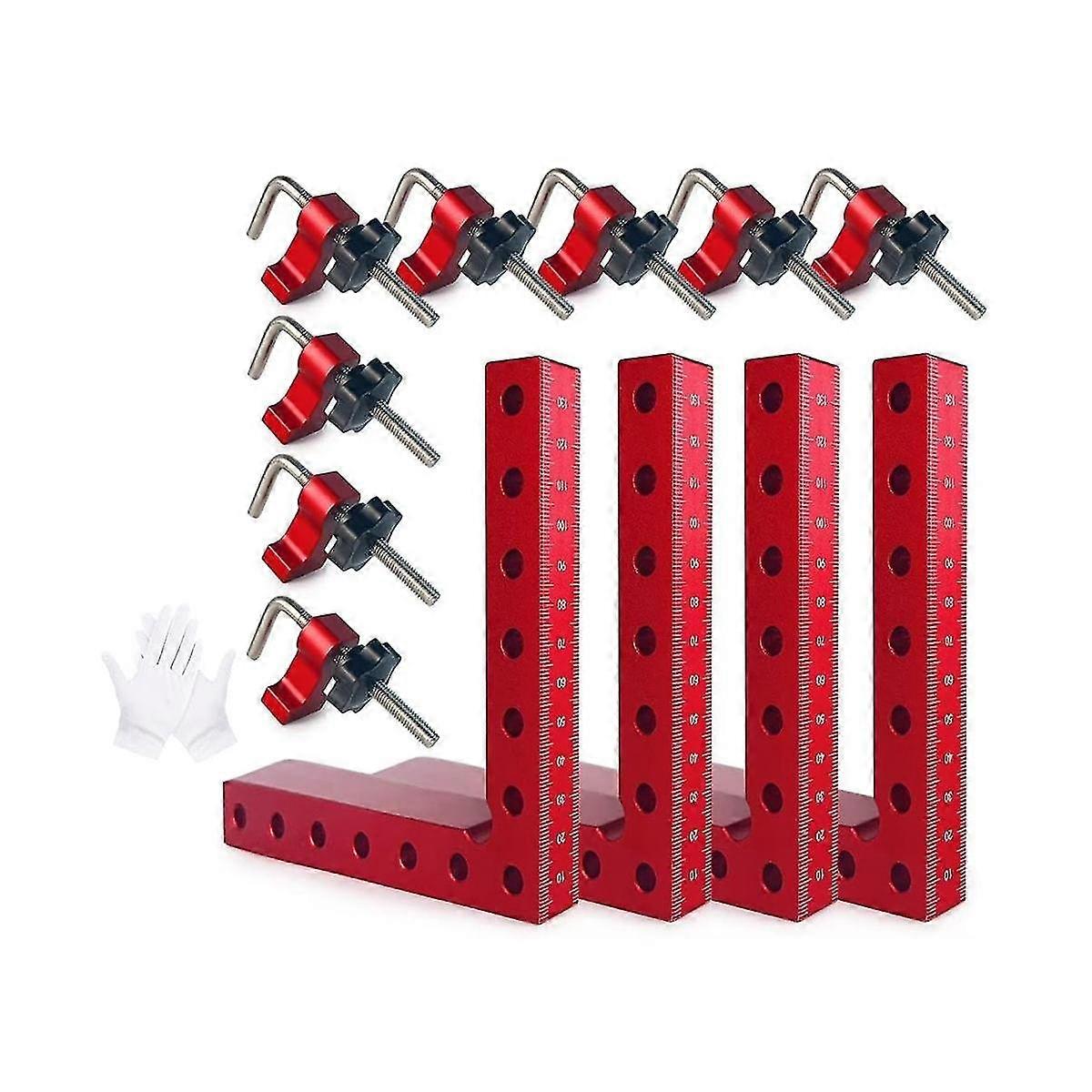 [90 Degree Wood Working Tools and Equipment Precision Angle Clamp]The square wood are made of high quality aluminum alloy to 90 degree precision, for tools, carsen clamp pro wood clamp kit, cabinet . The surface is red anodized, anti-rust and corrosion-resistant, CNC processing makes it more durable. [The Actual Use and Sales of Corner for Woodworking Show That](140mm/5.5 inch) Woodworking tools and accessories are a very scientific size choice. Perfect for assembling frames: picture frames, drawers, cabinets, furniture cabinets, , mailboxes, or maintaining any object you want to keep perfectly square at 90 degrees. [Corner Clamp are Widely Used]The wood for woodworking L has slightly chamfered edges that 't scratch your hands and woodwork to help level them during gluing, splicing, welding. Check and correct for 90 degree angles on wood, countertops, saw blades, etc. right angle clamp are a great tool to make woodworking projects easier. [Easy to Use] - The clamping square's design is simple and practical, very convenient to use. Even if you are new to woodworking, you can get started and quickly master the operation skills. And you are provided with a pair of gloves for ease of use.You'll be to get your work done efficiently, saving time and effort. [A Unique Gift for DIY Hobbyists or Woodworkers]This woodworking square clamping is a unique gift for fathers, husbands, Diy enthusiasts, boy/girlfriends, woodworkers. size: 140mm Material: aluminium alloy colour: red Package Contents: 4 x Right Angle Rulers 8 x Jigs 1 pair gloves Only the above package content, other products are not included. Note: Light reflection and different displays may cause the color of the item in the picture a little different from the real thing. The measurement allowed error is +/- 1-3cm.