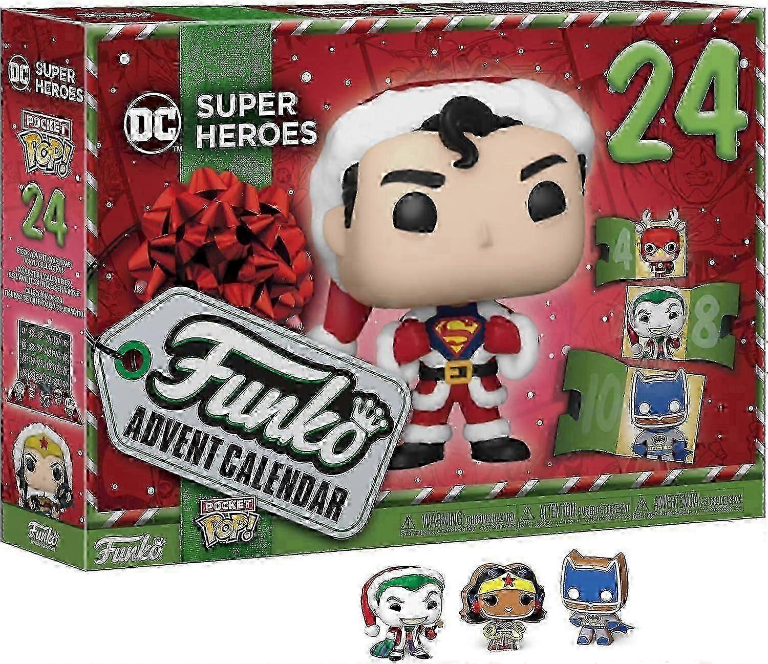 Specifications: DC Model, Quantity: 1Features:Collect, Play, Display: Open the small door to reveal 24 unique Funko Pocket Pops to collect. Place them in front of the pattern on the packaging to create and display a charming display.Countdown to Christmas: The countdown to Christmas is almost as exciting as the holiday itself. A children's advent calendar can help you make the most of this special time. Collect this countdown calendar and play with the unique minifigures!An Exciting Gift for Everyone: This advent calendar is a special Christmas gift for adult_s, children, boys, and girls aged 3 and up. Make the countdown to the Christmas season memorable with this officially licensed advent calendar.Daily Surprises: Includes 24 unique minifigures to collect. Who will join you on your holiday adventures? The size of the Pocket Pop collectible figures varies depending on their height. The maximum figure height is approximately 1.87 inches.Note: 1. Due to different monitors and lighting effects, the actual color may vary slightly from the image.2. Due to manual measurement, please allow 1-3 cm deviation.