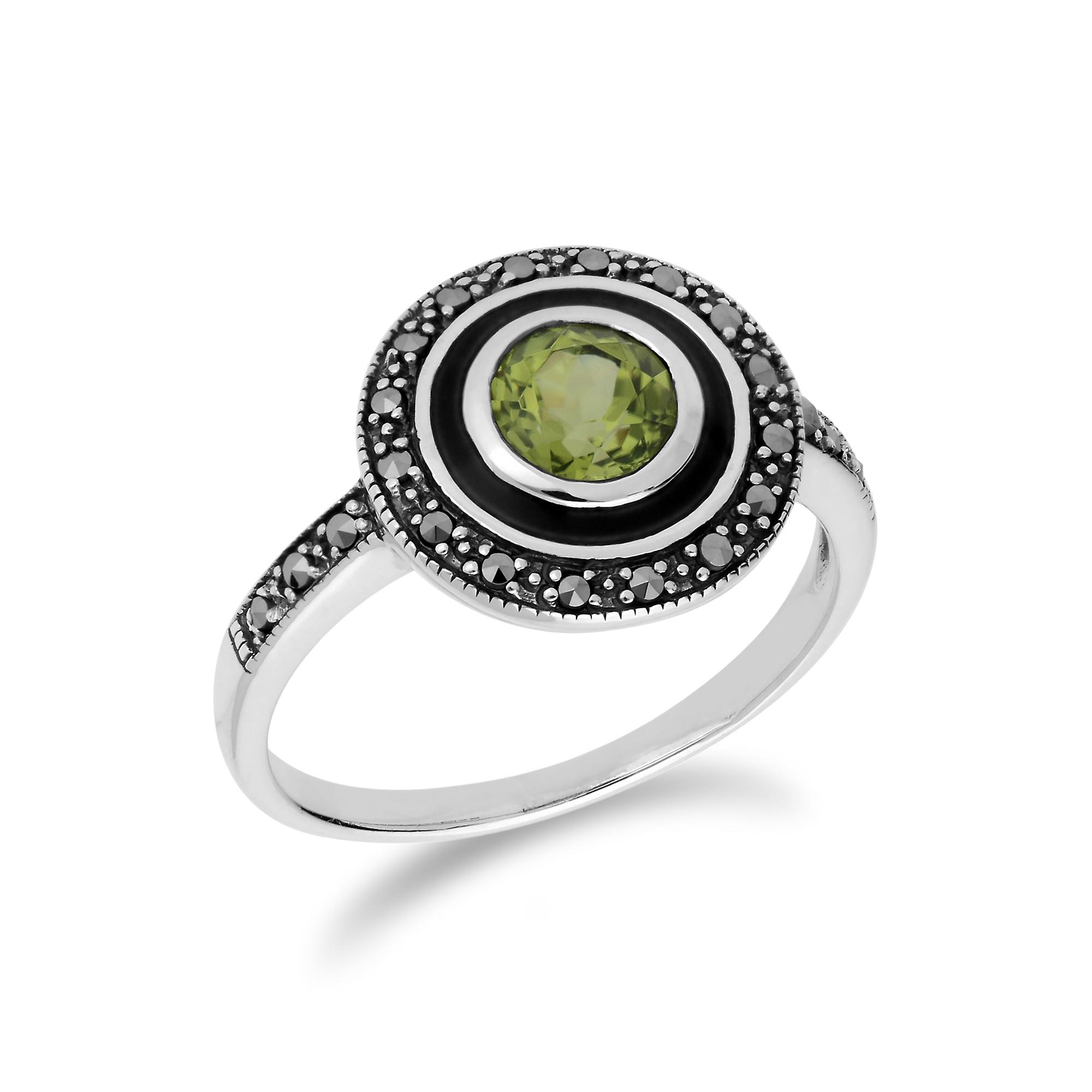 Art Deco Style Round Peridot & Black Enamel Halo Ring in 925 Sterling Silver 214R599604925