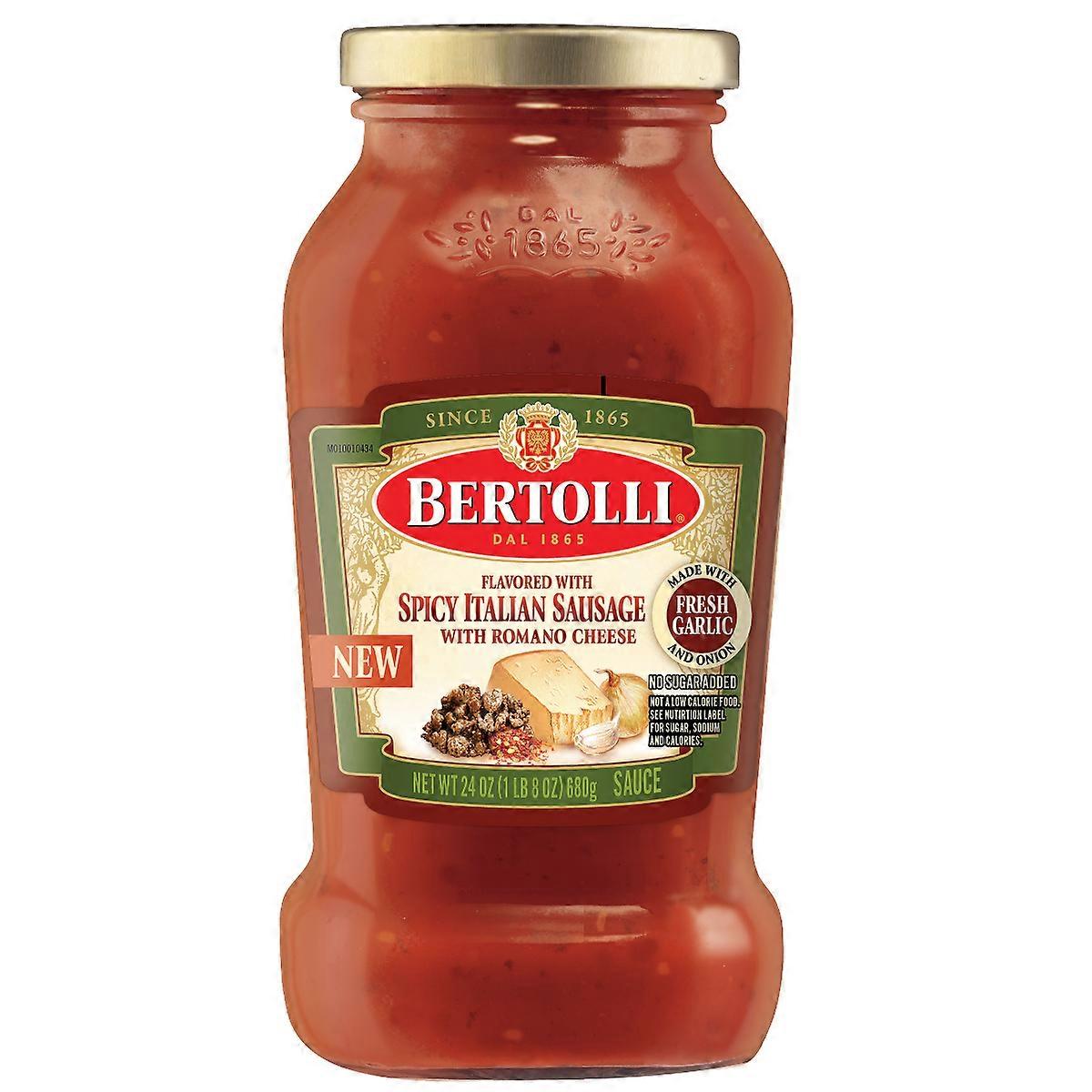 One 24 oz jar of Bertolli Spicy Italian Sausage Sauce with Garlic and Romano Cheese, Authentic Tuscan Style Pasta Sauce Simple is the Bertolli Way - Create delicious dishes with some heat like Spicy Eggplant Marinara, Hot Beef Bolognese, Hearty Lasagna, and appetizers like flatbreads, and soups, perfect for dinner parties or home entertaining Carefully crafted tomato sauce - Spicy Italian Sausage pasta sauce is prepared with vine-ripened succulent tomatoes, Italian sausage, garlic, Romano cheese, onions and herbs & spices for an authentic Italian style pasta sauce Simple is the Bertolli Way - Authentic and delicious pasta sauce that follows the Tuscan tradition of uncomplicated recipes, cooked lightly in olive oil to lock in layers of flavor High-Quality Ingredients - Bertolli pasta sauce is made with select ingredients, no added sugar, fresh garlic and onion for a balanced and sophisticated tomato sauce with a kick