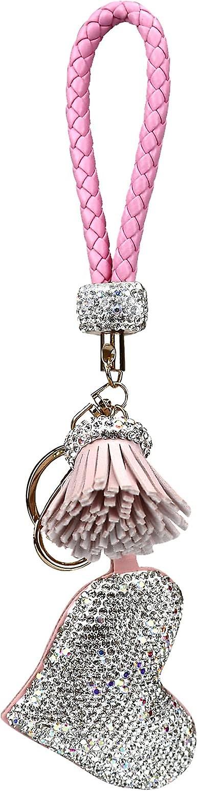 Heart-Shaped Rhinestone Keychain with Leather Tassel for Women and Girls Bling Keychain Gift