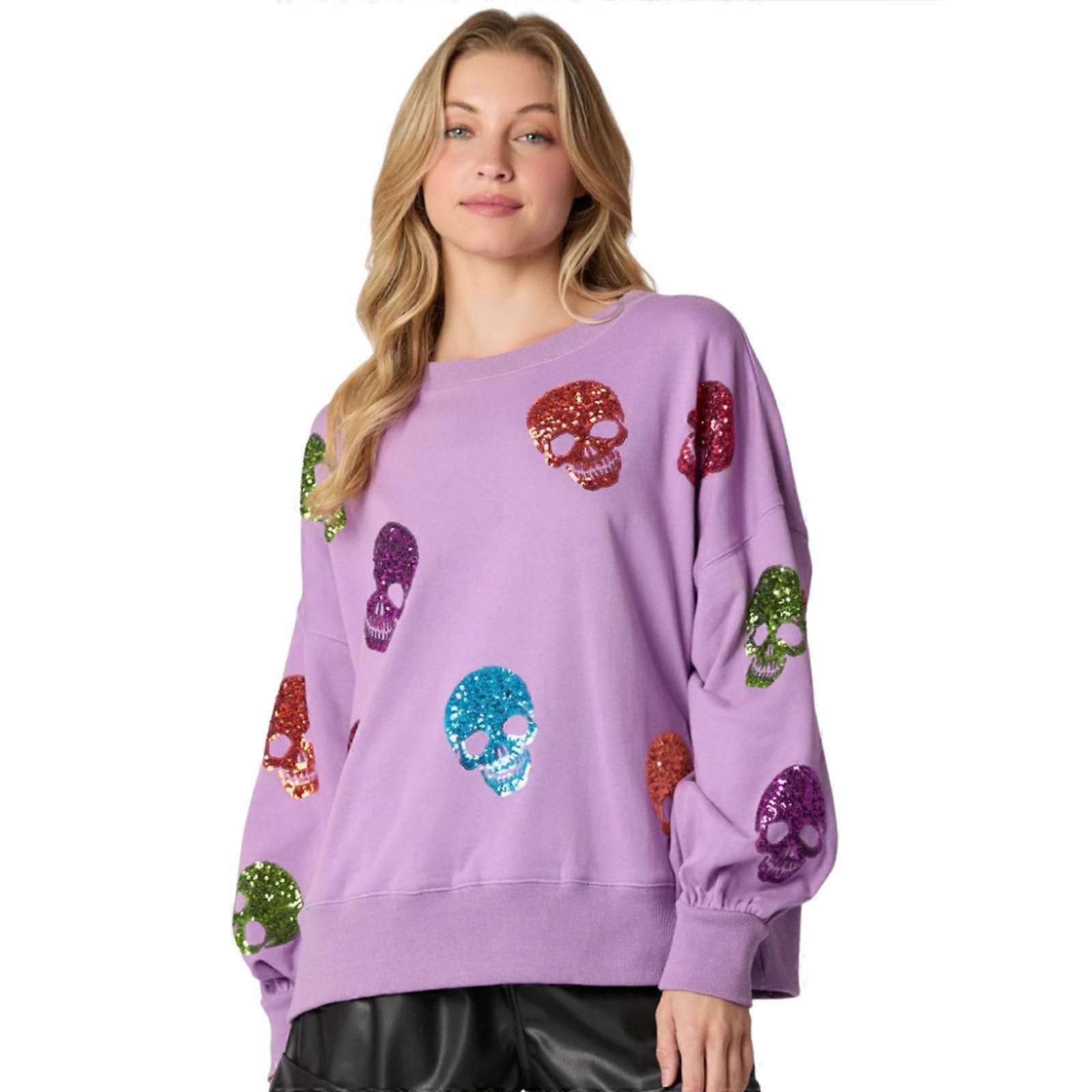 Casual Women's Sweatshirt With Sparkling Skull Round Neck Long Sleeve Pullover Top for Halloween Party Daily Wear Purple XL