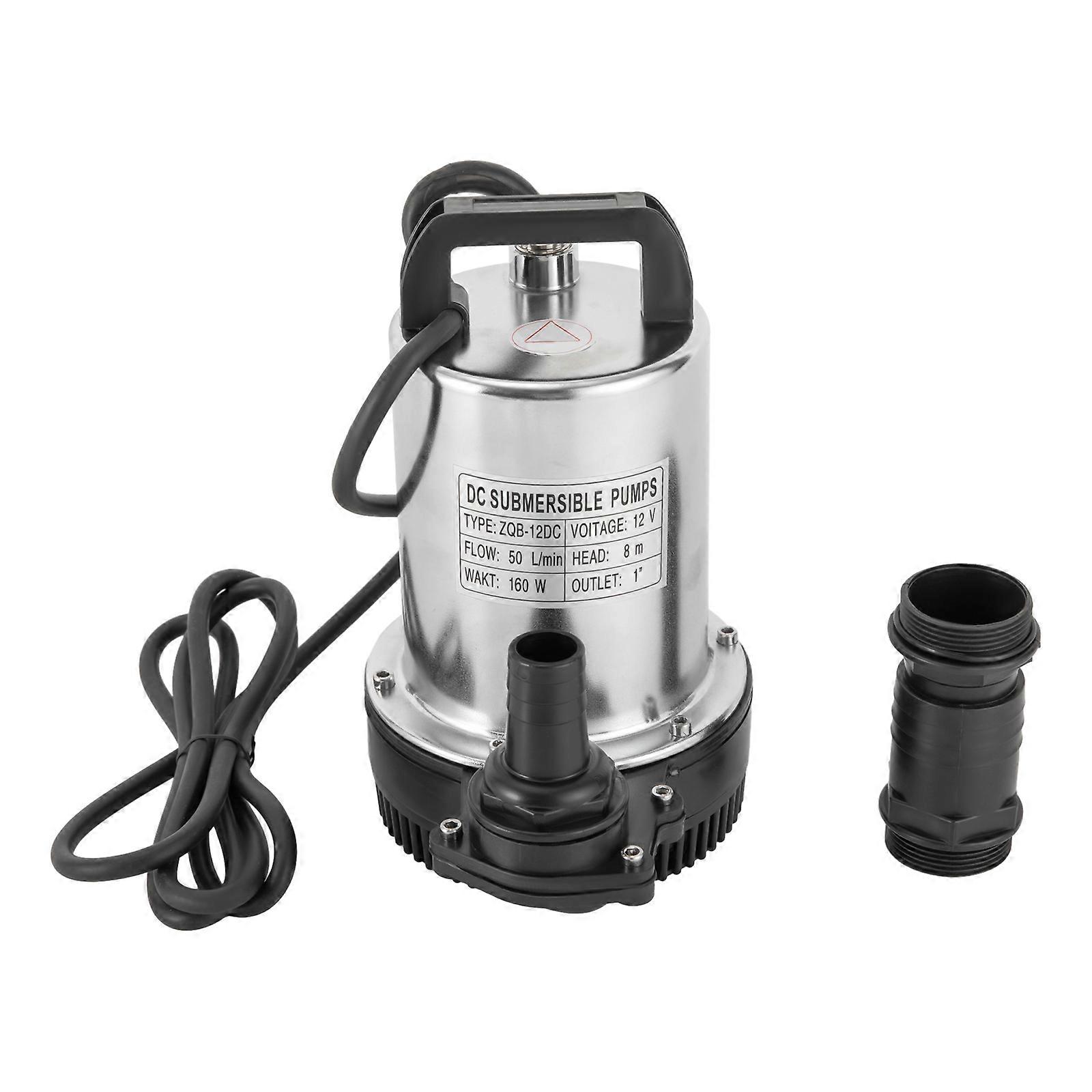 This submersible pump is made of high-class chrome paint through the polishing process, its excellent pressure and corrosion resistance ensures that the product remains stable in extreme environments and is not easy to deform. 160W high power and 3000rpm speed can quickly pump water from rivers or reservoirs, which provides plenty of power to realize high-head irrigation in gardens or farms. This is a good choice for improving irrigation efficiency. Key Features Build to Last: It is made of high-class chrome paint, and adopts a polishing process, making it solid, and not prone to rust and corrosion, so it can remain beautiful and practical for a long time. High Efficiency: The 160W strong power, 3000rpm speed, and maximum 13.21gal/min flow rate make your pumping and watering work faster and easier. Low Noise: The operating sound of the product is between 0-30dB, allowing you to have a relatively quiet pumping environment without disturbing others. Large Delivery Lift: The maximum lift of the pump is 26.25ft, which allows you to irrigate farmland, fish ponds, and orchards for a long distance, saving the time and cost of manual transportation. Powerful Pumping Assistant: Whether you're looking for a solution for industrial or farm water supply, this pump is a trusted choice. It serves as a garden water source as well as a sprinkler for the kids. You can use this product to pump water from ponds, reservoirs, rivers, and other water-lifting projects. Easy to Carry: The compact structure and the top handle make it convenient to take to different workplaces.   Simple Installation: Simple construction and complete accessories make it easy to put together and get up and running quickly. Details Standard Water Outlet: The pump adopts a 1-inch large diameter water outlet, which can be matched with different types of water pipes and is very practical. 3 Plastic Non-slip Feet: They can make the product stable and less likely to tip over. Long Power Cord: The 9.84ft long power cord increases safety and convenience for you. Application This product is suitable for extracting groundwater from deep wells, and can also be used in water-lifting projects of rivers, reservoirs, canals, and so on. It can be used for farmland irrigation, and water for humans in mountainous areas, villages, homes, farms, campervans, cities, factories, and railways. Specifications Material: Chrome Paint, Plastic Color: Silver, Black Process: Polishing Assembly Required: Yes Power Source: Corded Electric Voltage: DC 12V Power: 160W Speed: 3000rpm Noise: 0-30dB Delivery Lift: 8m/26.25ft Flow Rate: 50L/13.21gal/min Outlet Diameter: 2.54cm/1in Power Cord Length: 3m/9.84ft Total Diameter:14cm/5.51in Height: 21cm/8.26in Package Included 1* Submersible Pump 3* Water Outlets Notes 1.Please do not use it without water. 2.Please note that the pump needs to be installed vertically. 3.Please note that the pumping speed is related to the depth at which the water pump enters the water, and the deeper the depth, the lower the speed. 4.Please note that this product is only suitable for pumping clear water, not oil, chemical raw materials, and other liquids.