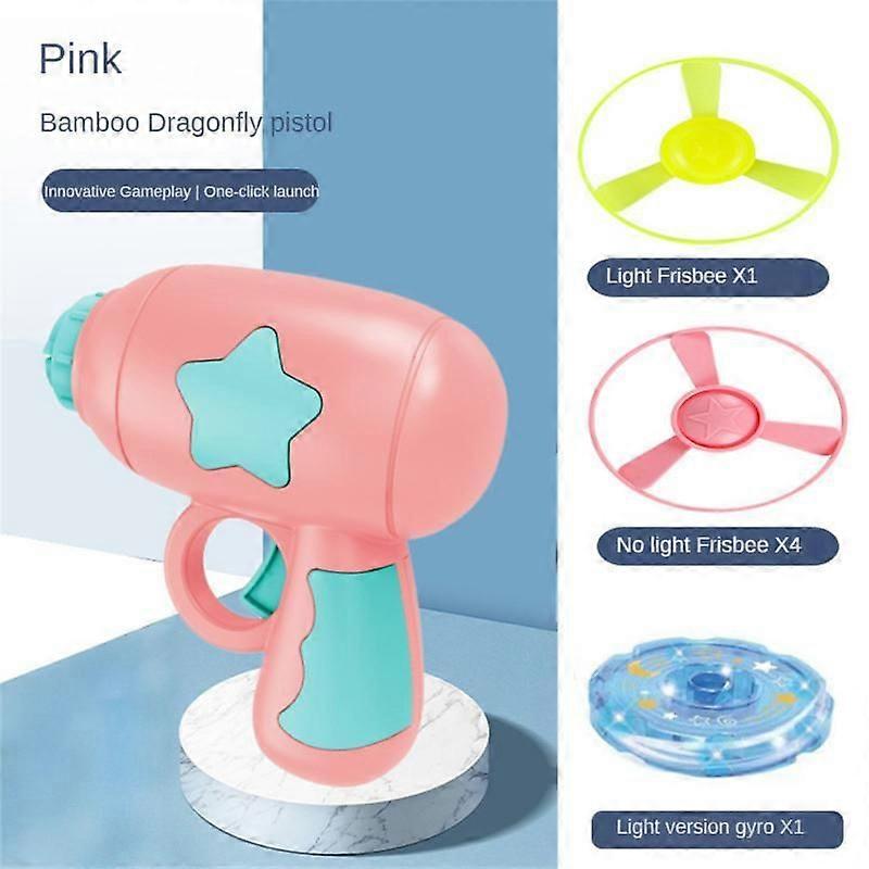 Children's Toy Pistol Flying Toy Luminous Bamboo Rotating Flash Dragonfly Catapult Pistol Colorful Description: Product name: colorful bamboo dragonfly Style: pink, blue, dark blue, yellow Applicable age: above 3 years old Material: plastic+electronic components Size: 10.5 * 11cm Specifications: 1. The pistol flying toy can cultivate children's imagination and creativity, and exercise children's grasping ability and body coordination ability. 2. It can fly without battery, let children enjoy it, accompany children to grow up healthily, and create children's childhood dreams! The edges are round, free of burrs, and resistant to falling and collision. 3. Flashing colorful lights are more cool in the dark. The glowing bamboo dragonfly can emit flashing lights by gently throwing it down. 4. The edge is smooth and burr-free, and the size is moderate and easy to grasp. The toy gun with smooth edge can help children play at ease, and is also suitable for training children's grasping ability. Package Included: 1 * Pistol 1 * Light version 4 * Lightless 1 * Light version gyroscope