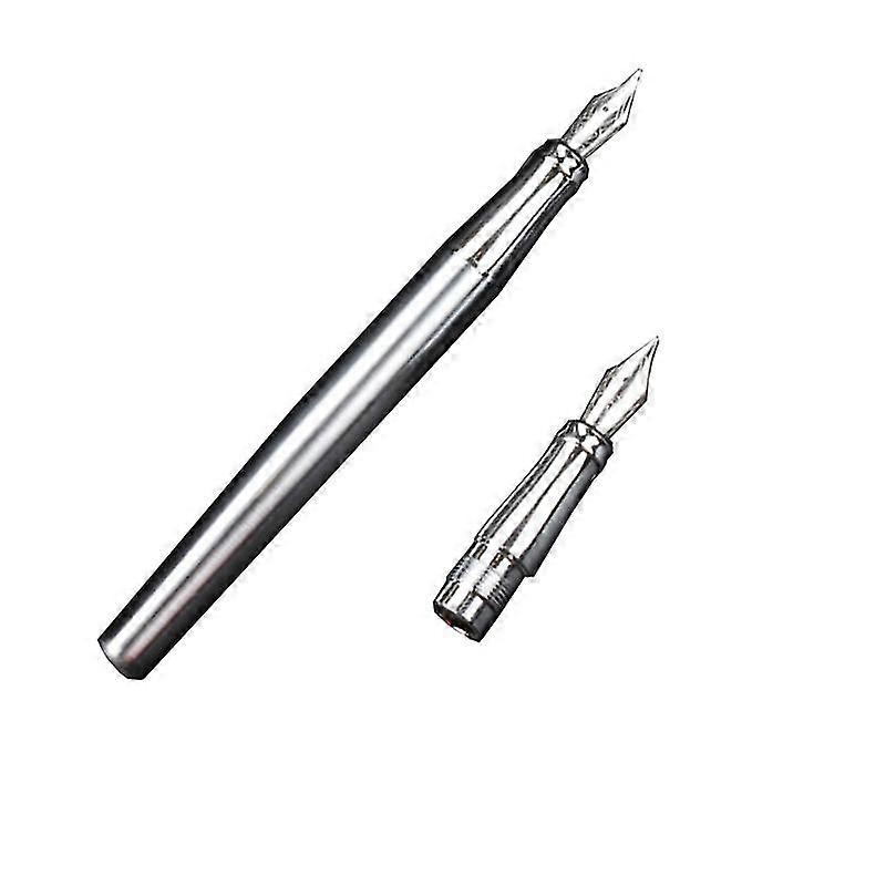 FeaturesGenerous and luxurious designHigh quality of metal steel materialBent nib calligraphy pen, writes freely and smoothlyComfortable to hold, best for choosingGreat for calligraphy, writing, signing, practice etc.SpecificationPen is a powerful means of mankind for inheritance of civilizations, recordation of thoughts and communication of feelings. Nowadays the pen has exceeded the writing function itself. To possess a pen with integrity of quality and perfect design becomes a symbol of nobility. A Pen of celebrated brand should both have the features of exquisite workmanship, smooth comfortable writing, which enables it to witness the important historical moments, and of art works with decorations of pure gold, gem and crystalPen Cap: Push type Nib: Bent Nib (0.5+1.0mm)Ink: Work with bottled ink or standard cartridgesLength(Approx): 132mmWeight(Approx): 28gDiameter: 11mmColor Classification: Pure silverApplication Scene: Calligraphy/Office/Business/Student/Writing/GiftTips:Please allow 1-3cm error of measurement.Photo color might be a little different from the actual product due to color display of different monitors.Product Includes:1* Fountain Pen (Come with converter,but does not contain ink for safety)1* Pen Tip1* Pen Box