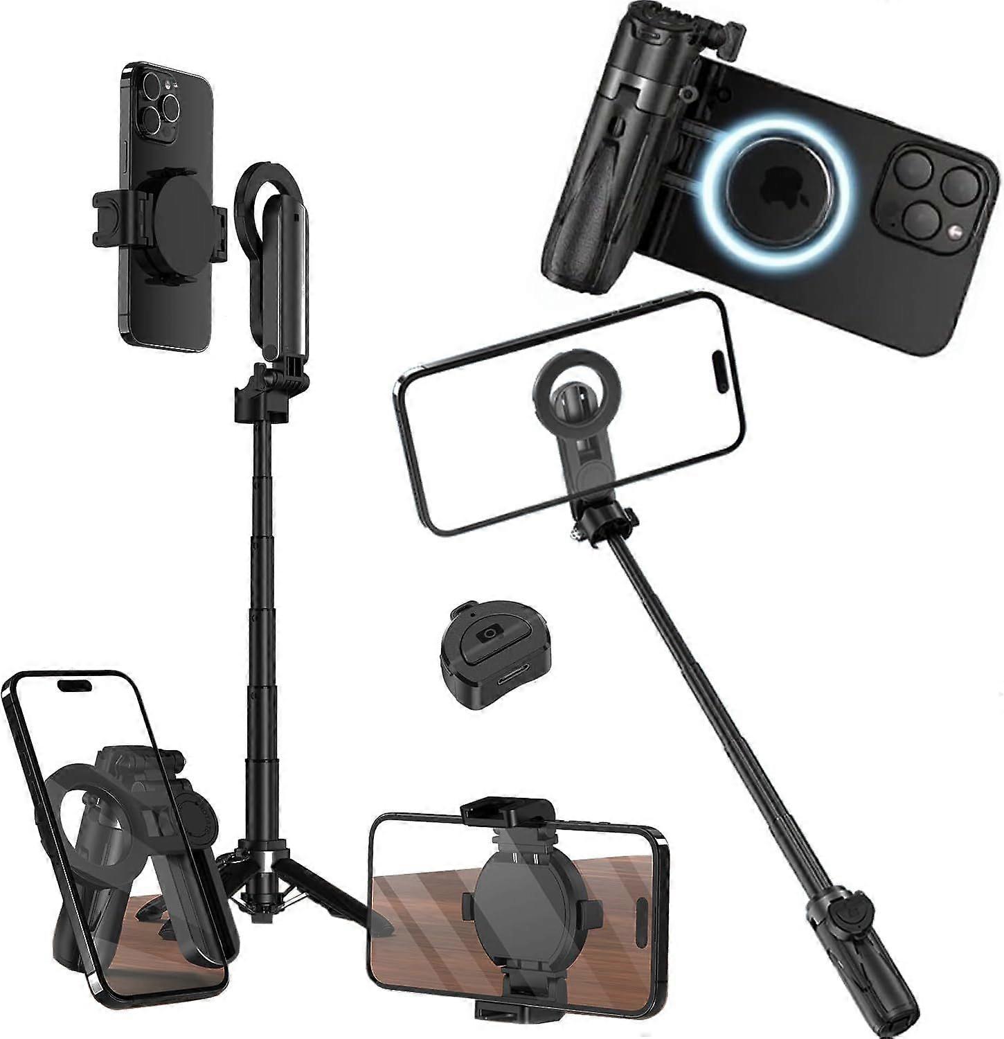 Esimen 2 in 1 Clip and Magnetic Phone Tripod Holder - Portable Pocket Selfie Stick with Remote Control Metal Ring, Quadpod Base, Magsafe Tripod Holder