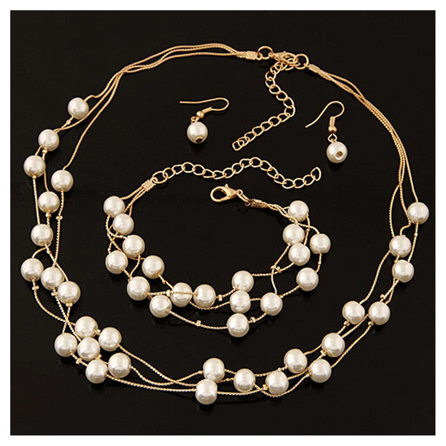 Women Jewelry Set Necklace Bracelet Earrings Faux Pearl Decor Multi Layers Necklace Adjustable Stain
