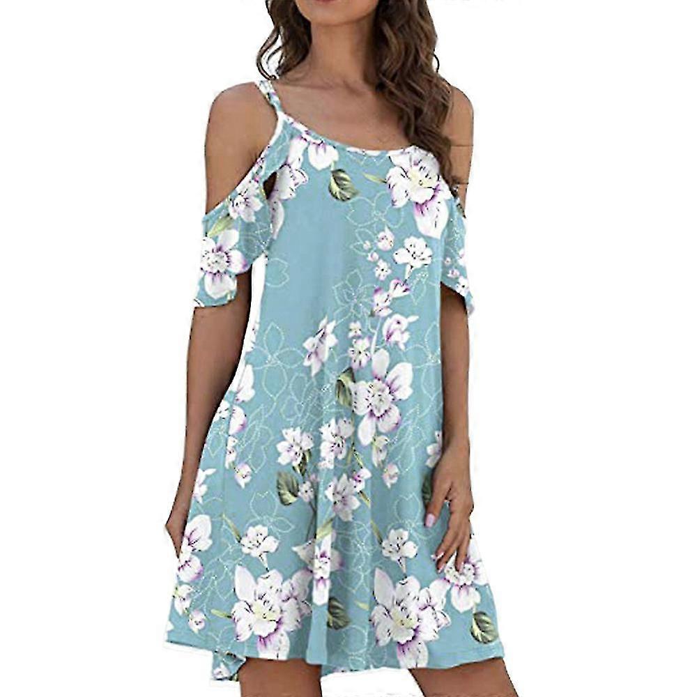 Women Floral Print Summer Mini Dress Cold Shoulder Short Sleeve Dresses With Pocket