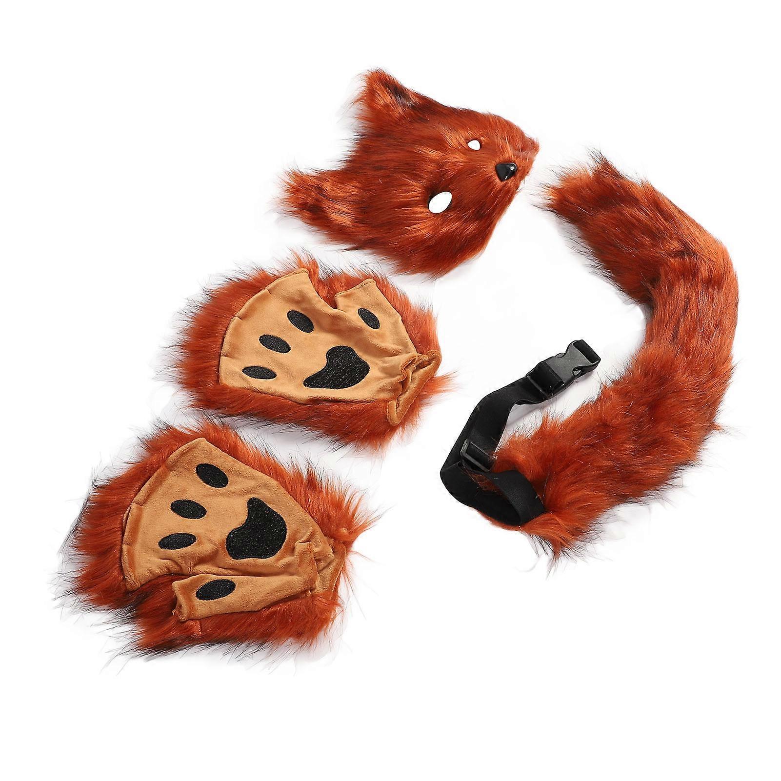 Fox Face Cover Gloves Tails Set Fluffy Plush Faux Fur Soft Skin Friendly Costume Accessories Animal Fox Tail Cosplay Set for Women Girls Red Brown