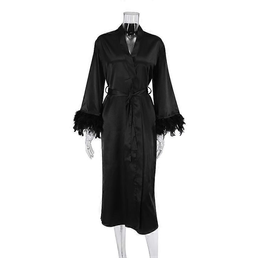 Women's Long Sleeve Satin Fuzzy Trim Robe Bridesmaid Robe Wedding Party Robe