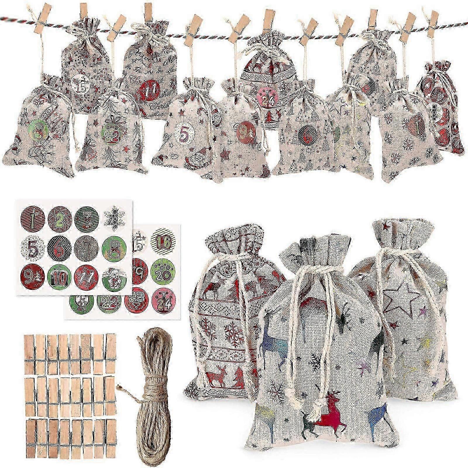 Advent Calendar for Filling DIY Advent Calendar Jute Bag Advent Calendar Christmas Gift Bags 24 Christmas Calendar Set Fabric Bag with 1-24 Advent Numbers Stickers Feature: DIY Christmas advent calendar fabric bag: 24 fabric bags, 24 stickers with numbers, 24 wooden clips, 10 m rope. Christmas decoration: the advent calendar with drawstring is ideal for hanging on the wall, Christmas tree, door, wall or mantelpiece. size: 10 x 14 cm size to candy, biscuits, chocolate and other small things for your children. You can also jewellery, cosmetics, coins and crafts, etc Quality: The Christmas Advent Calendar is made of linen. Fabric, wood, no irritating smell. You can use them at other exciting events or year. Beautiful advent calendar: each canvas bag is printed with beautiful patterns such as five-pointed,, snowflakes, bells, Christmas trees and Santa Claus. for Christmas decorations Packaging Includes: 24x fabric bags, 1x 24 stickers with numbers, 24x wooden clips, 1x 10 m rope