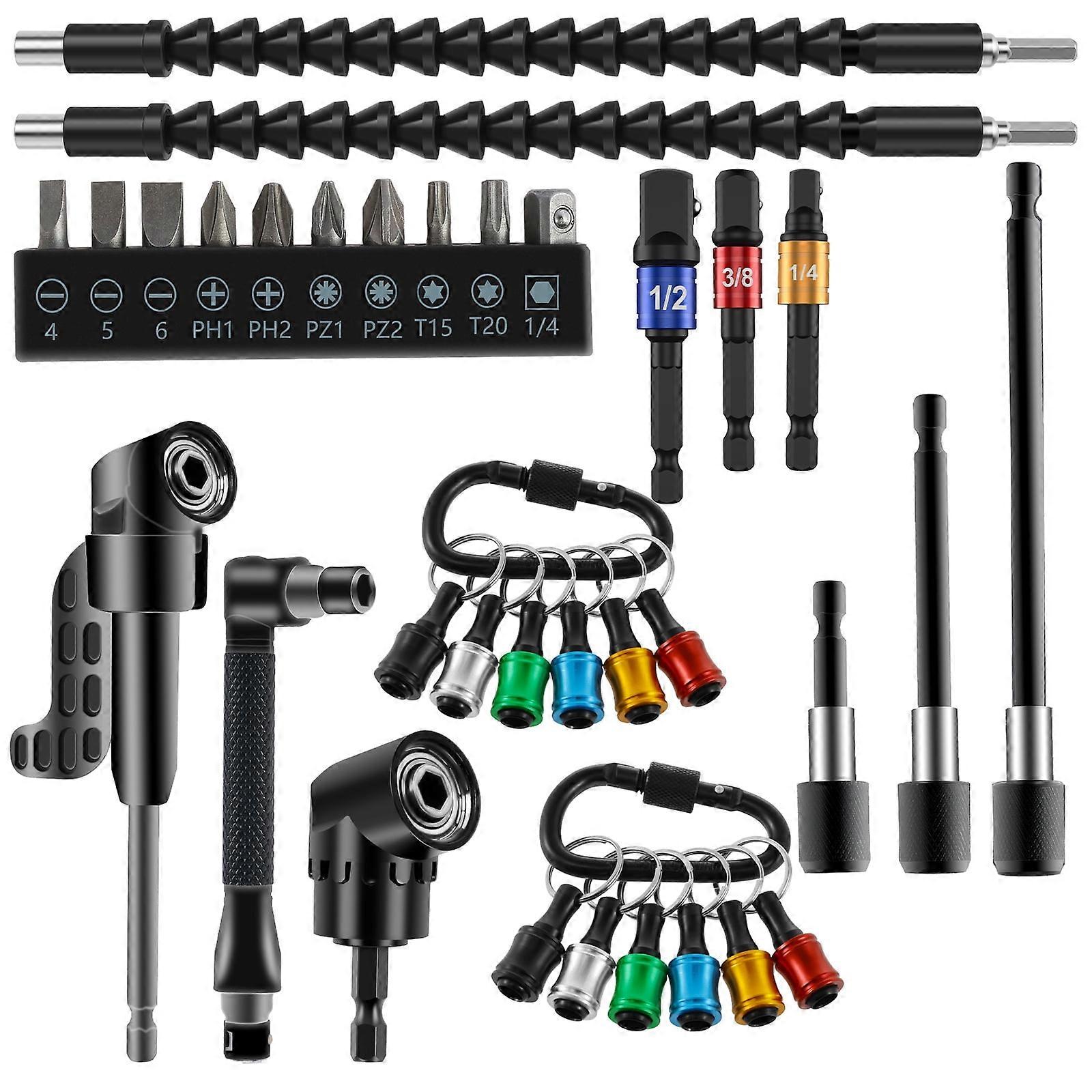Grusce 33Pcs 1/4" Hex Shank Screwdriver Bit Holder Kit with Flexible Extension, 105° Right Angle Adaptor, 1/4", 3/8", 1/2" Socket Adapter & Keychain